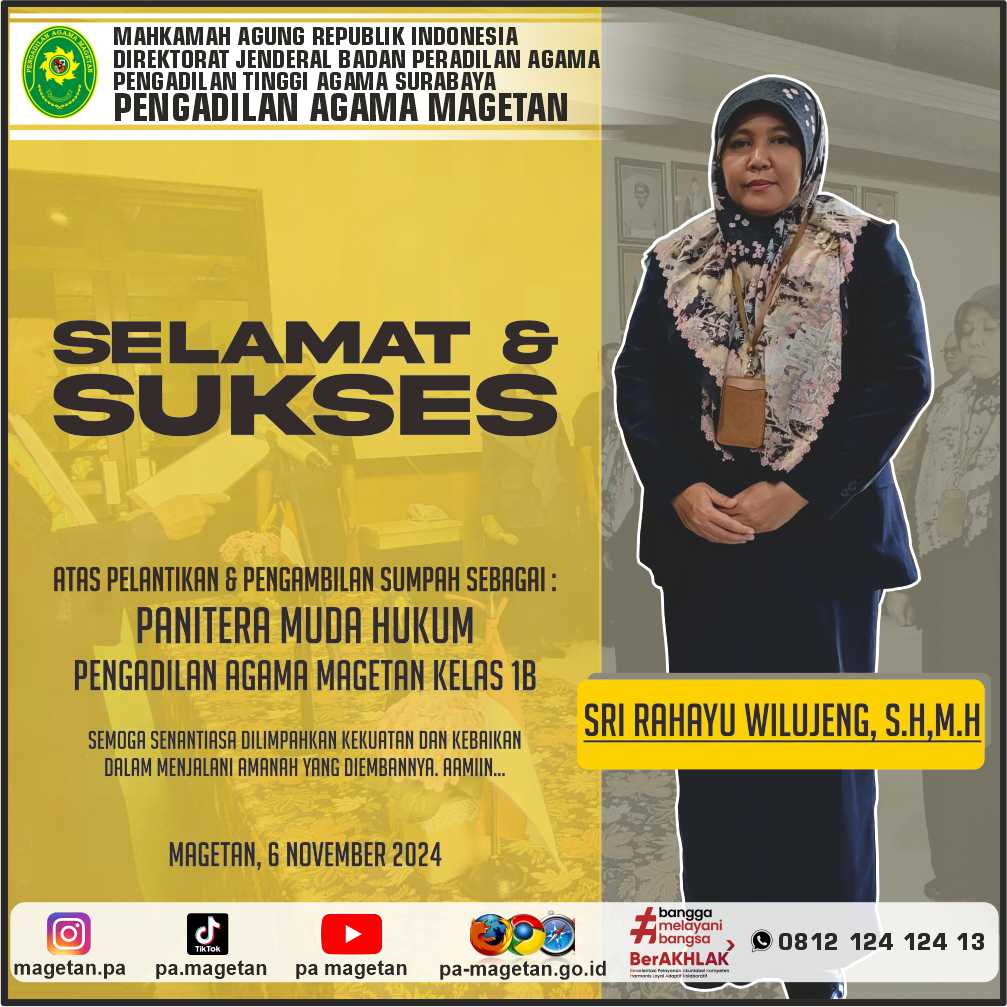 Selamat & Sukses Atas Pengambilan Sumpah & Pelantikan Sri Rahayu Wilujeng, S.H., M.H Written by Admin on 06 November 2024. Written by Admin on 06 November 2024. Hits: 498