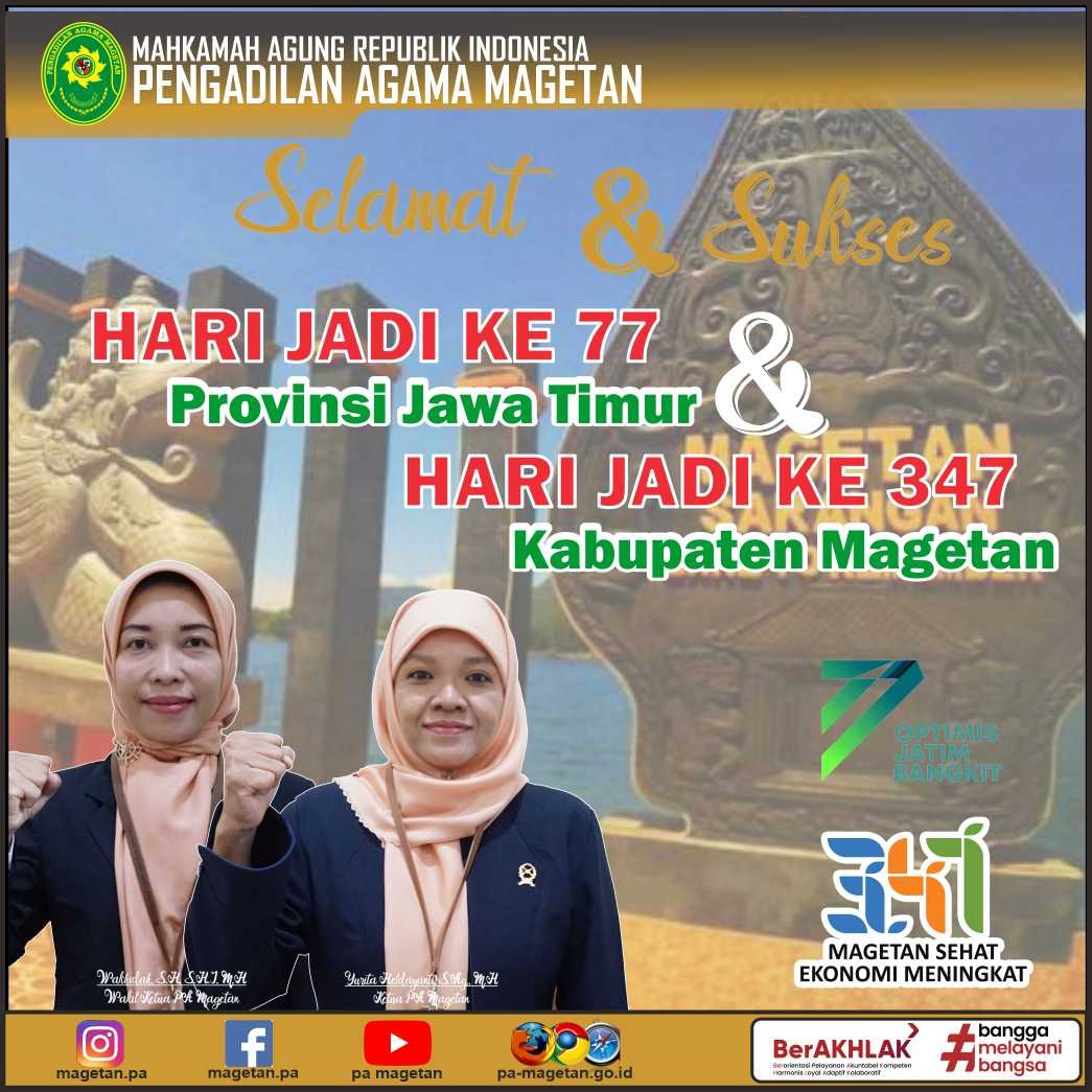 Ucapan Selamat Hari Jadi Jawa Timur Ke 77 & Kabupaten Magetan Ke 347 Written by Admin on 12 October 2022. Written by Admin on 12 October 2022. Hits: 940