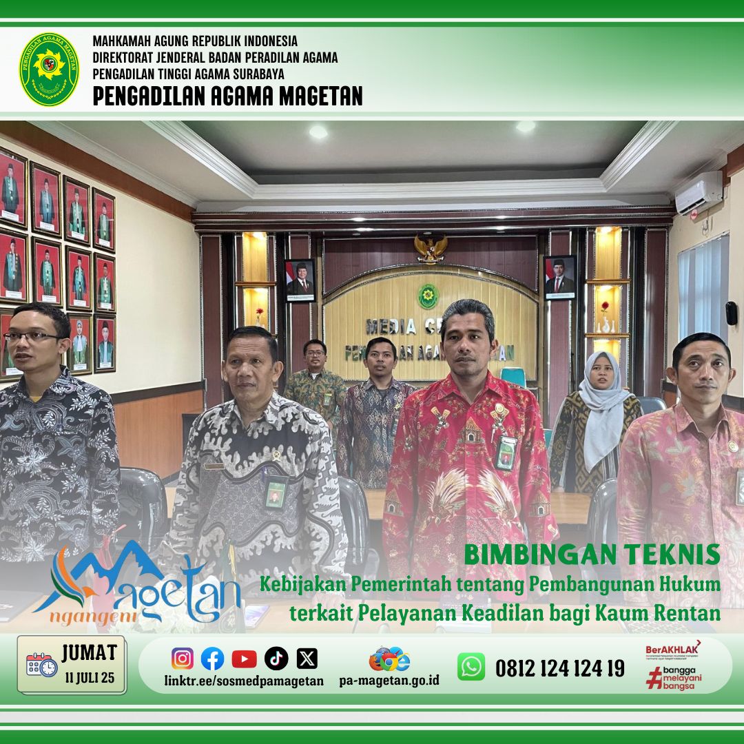 Magetan | pa-magetan.go.id | PA Magetan ikuti Bimtek Pelayanan Hukum Bagi Kaum Rentan. Bertempat di Ruang Media Center, Wakil Ketua Pengadilan Agama Magetan, Bapak Huda Lukoni, S.H.I., S.H., M.H., bersama para hakim mengikuti kegiatan Bimbingan Teknis secara daring pada Jumat (11/7/25) pukul 08.00 WIB. Kegiatan ini dilaksanakan secara online yang bekerja sama dengan Bappenas. Tema yang diangkat adalah “Kebijakan Pemerintah tentang Pembangunan Hukum terkait Pelayanan Keadilan bagi Kaum Rentan.” Acara ini dihadiri oleh peserta dari berbagai satuan kerja di seluruh Indonesia.
