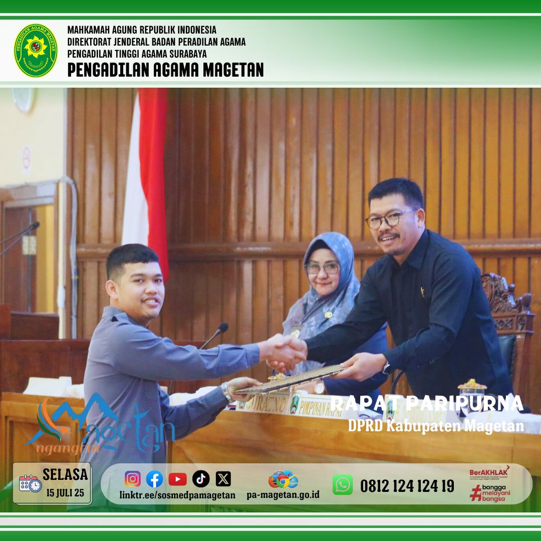 Magetan | pa-magetan.go.id |Selasa (15/7/25) Bertempat di ruang rapat paripurna gedung DPRD Magetan, Pengadilan Agama Magetan mengikuti kegiatan pengambilan keputusan terhadap Rancangan Peraturan Daerah (Raperda) Pertanggungjawaban Pelaksanaan APBD Tahun Anggaran 2024. Kegiatan ini dihadiri oleh Bupati Magetan beserta Wakil Bupati Magetan, Forkopimda, OPD, fraksi dari partai. Pengadilan Agama Magetan pada kegiatan ini diwakili oleh Hakim Pengadilan Agama Magetan, Dr.Drs. Sugeng., M.Hum.