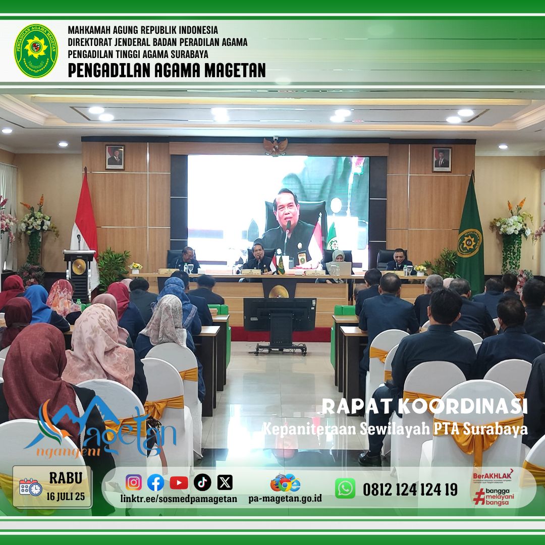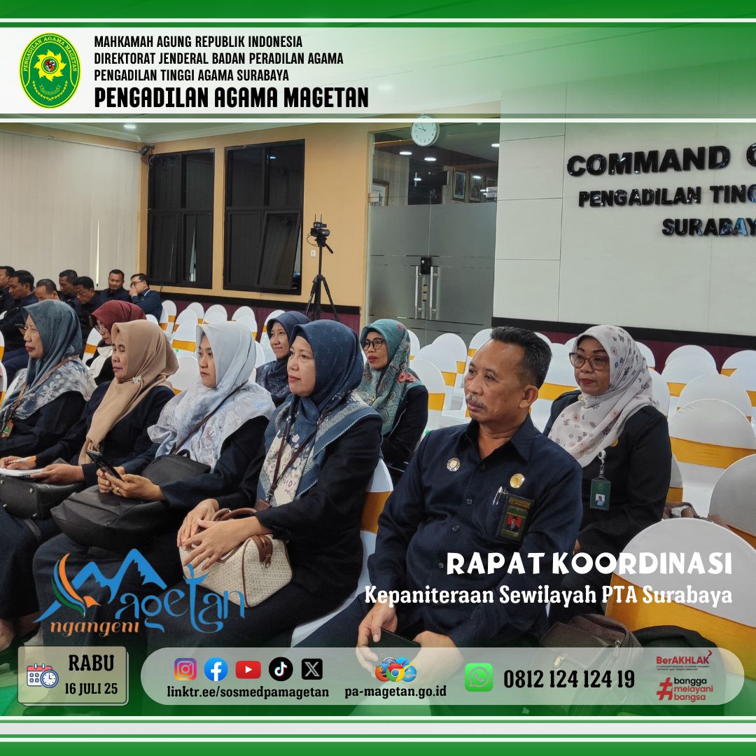 Magetan | pa-magetan.go.id |Pengadilan Tinggi Agama (PTA) Surabaya baru saja menyelenggarakan rapat koordinasi penting guna membahas peningkatan kompetensi Sumber Daya Manusia (SDM) dibagian kepaniteraan di seluruh wilayah hukumnya pada hari Rabu (16/07/2025). Rapat ini dihadiri oleh para Panitera (Hj,Nilna Niamatin, S.Ag.,M.H), Panitera Pengganti (Rahmad Pujiraharja S.H ), (Hj.Siti Marfu’ah S.H) dan Para Panitera Muda dari Seluruh Jawa Timur. Tema Kegiatan ini adalah “Kode Etik dan Pedoman Perilaku Panitera dan Jurusita”. Kegiatan ini betujuan untuk menunjukkan komitmen bersama untuk mencapai keunggulan untuk mengembangkan kompetensi dan profesionalisme staf kepaniteraan, mengingat peran mereka dalam mendukung sistem peradilan yang efektif.