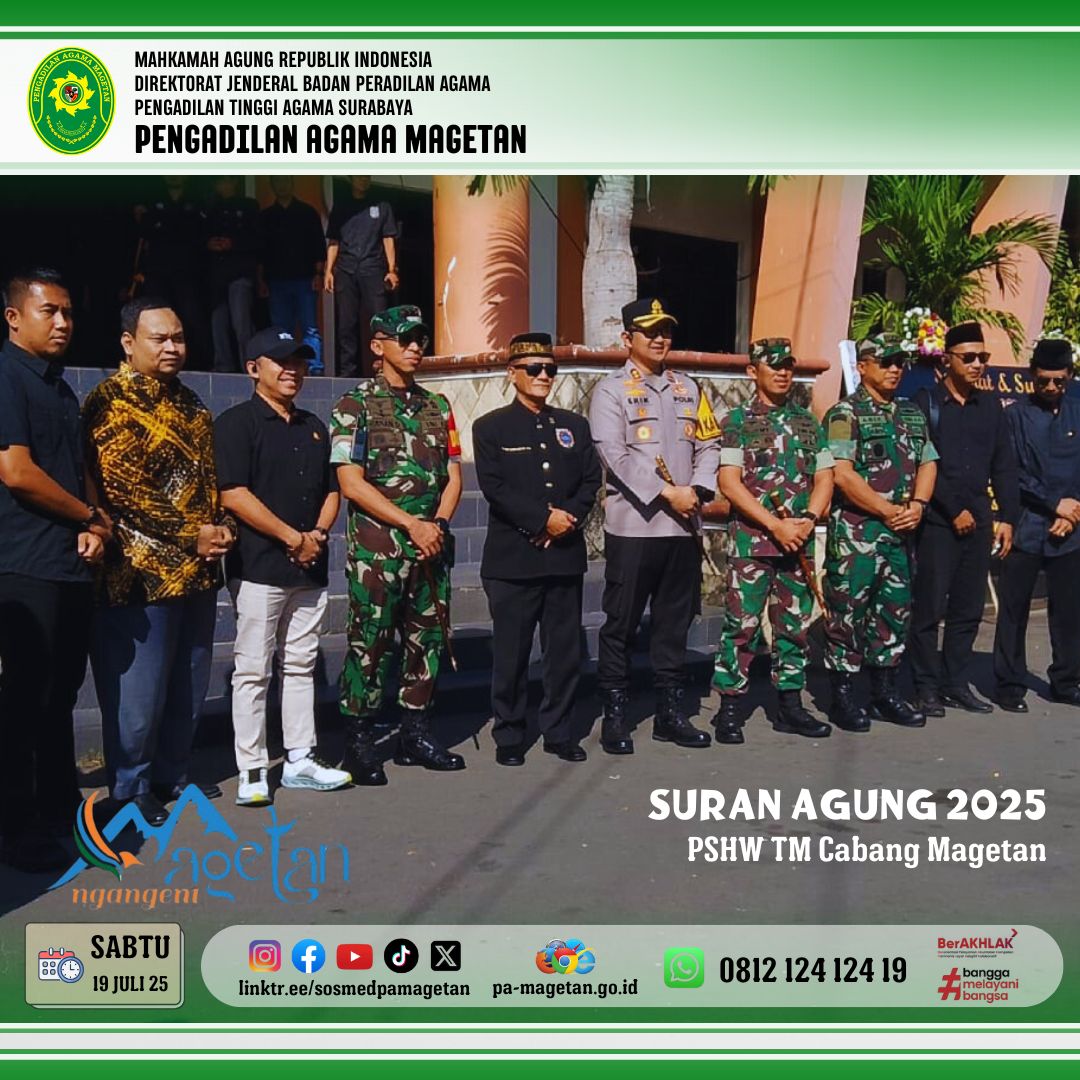 Magetan | pa-magetan.go.id | Suran Agung 2025 yang diselenggarakan oleh Persaudaraan Setia Hati Winongo Tunas Muda (PSHWTM) Cabang Magetan pada Sabtu (19/7/25) bertempat di GOR Ki Mageti. Pengadilan Agama Magetan yang diwakili oleh Bapak Antoni Windika, S.H. hadir dalam kegiatan yang berlangsung pada pagi hari tersebut. Selain itu, kegiatan tersebut juga dihadiri oleh Forkopimda Kabupaten Magetan. Kegiatan tersebut dilaksanakan dalam rangka memperingati Ulang Tahun Persaudaraan Setia Hati Winongo Tunas Muda (PSHWTM) yang ke-122 dan untuk menjalin silaturahmi terhadap seluruh saudara seasuhan.