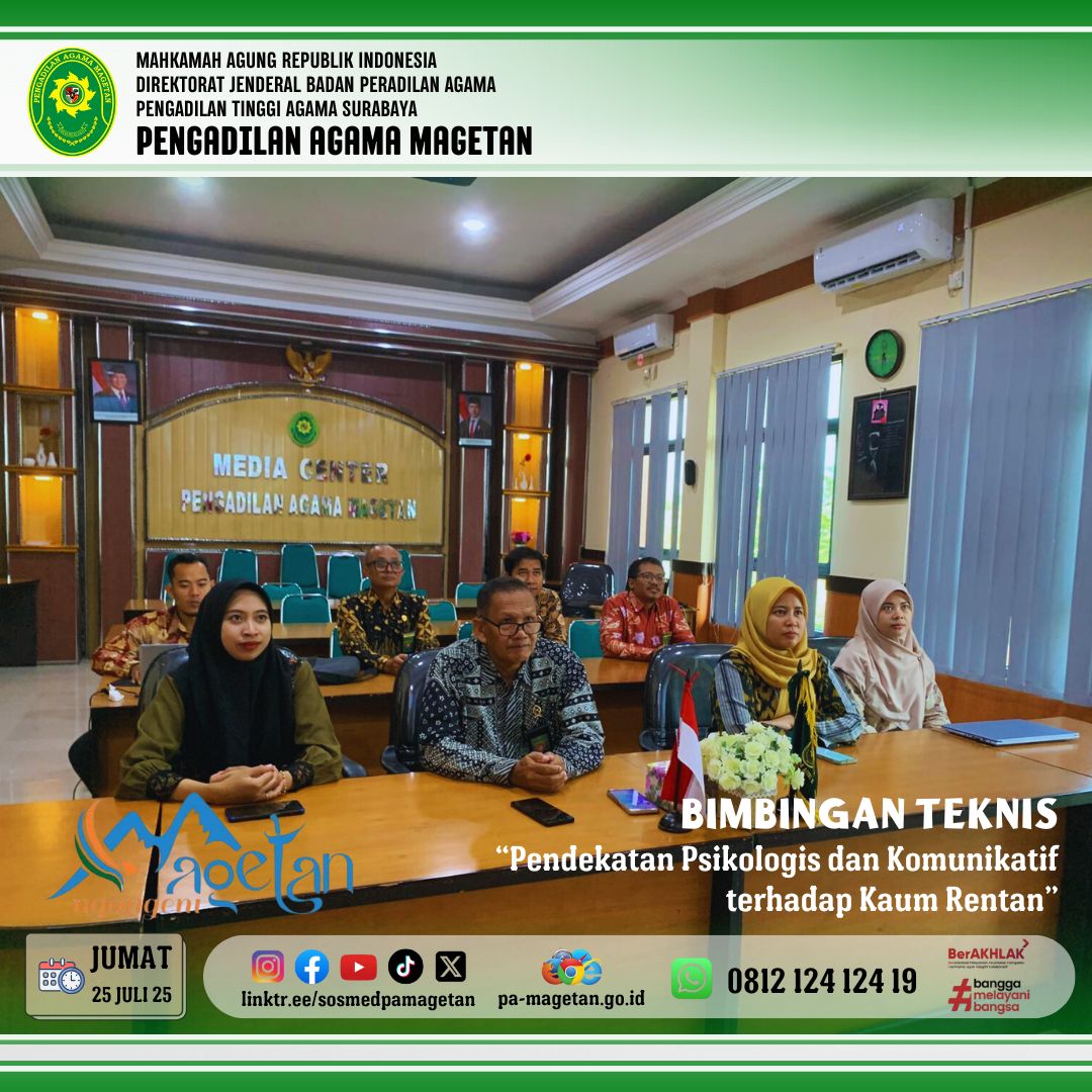 Magetan | pa-magetan.go.id | Pengadilan Agama Magetan mengikuti Bimbingan Teknis (Bimtek) Kaum Rentan Berhadapan dengan Hukum, Jumat, 25 Juli 2025, Direktorat Jenderal Badan Peradilan Agama (Badilag) Mahkamah Agung RI mengadakan Bimbingan Teknis (Bimtek) Kaum Rentan Berhadapan dengan Hukum dengan tema "Komunikasi Terhadap Kaum Rentan" yang dilaksanakan secara daring (online) yang dihadiri oleh Para tenaga teknis di lingkungan Peradilan Agama, termasuk Ketua, Wakil Ketua, Hakim, Panitera, Panitera Muda, Panitera Pengganti, dan Jurusita di berbagai Pengadilan Agama di seluruh Indonesia.