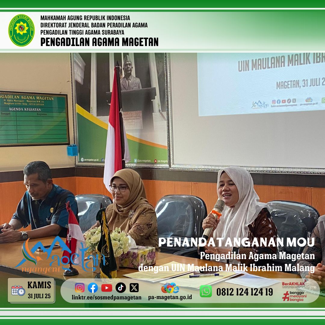 Magetan | pa-magetan.go.id | Pada hari Kamis (31/07/2025)Pengadilan Agama Magetan Jalin Kerja Sama dengan UIN Maulana Malik Ibrahim Malang. Pengadilan Agama Magetan menandatangani nota kesepahaman (MoU) dengan Universitas Islam Negeri Maulana Malik Ibrahim Malang sebagai bentuk sinergi dalam bidang pendidikan, penelitian, dan pengabdian masyarakat. Penandatanganan dilakukan di Kantor Pengadilan Agama Magetan pada Selasa, 30 Juli 2025. Kegiatan ini dihadiri oleh pimpinan dari kedua lembaga serta jajaran pendukung dan mahasiswa. MoU ini menjadi dasar resmi pelaksanaan praktik lapangan dan kerja sama kelembagaan ke depan.