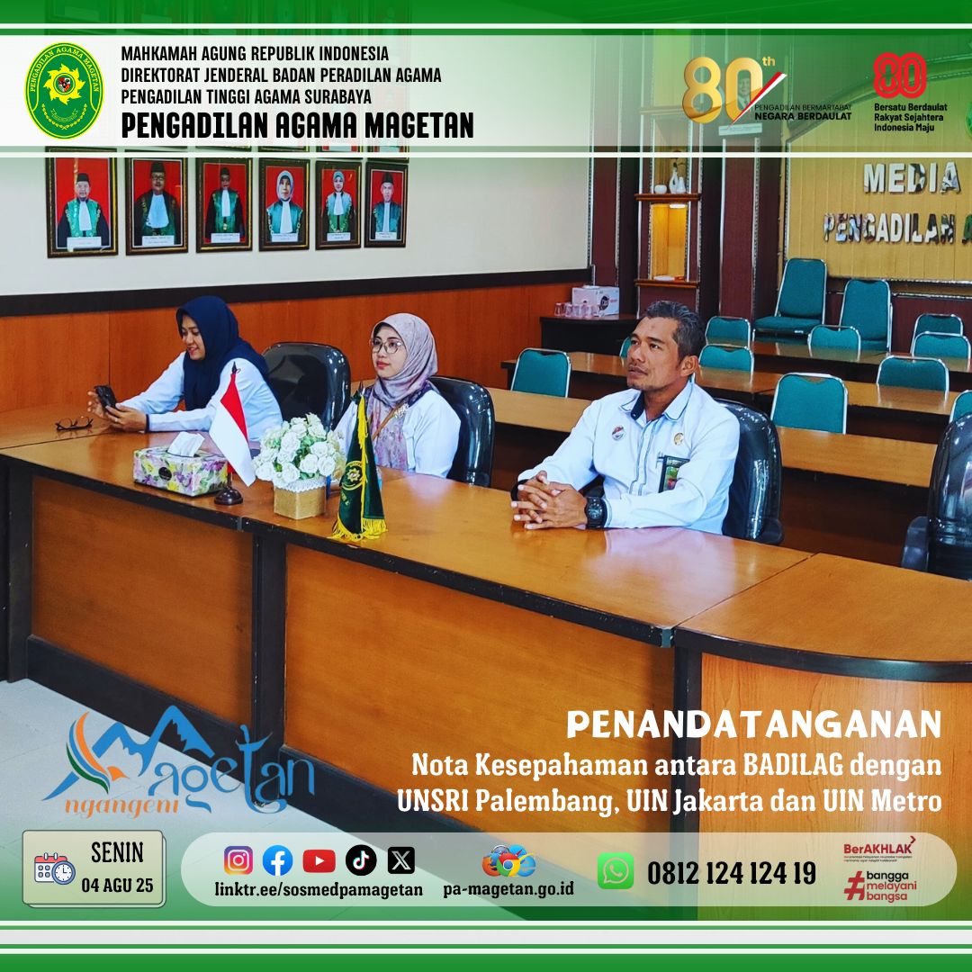 Direktorat Jenderal Badan Peradilan Agama (Ditjen Badilag) Mahkamah Agung Republik Indonesia menyelenggarakan kegiatan Penandatanganan Nota Kesepahaman (MoU) bersama tiga perguruan tinggi ternama, yaitu Universitas Islam Negeri (UIN) Syarif Hidayatullah Jakarta, Universitas Sriwijaya Palembang, dan UIN Raden Intan Jurai Siwo. Kegiatan ini dilanjutkan dengan kuliah umum yang disampaikan oleh Guru Besar Universitas Sriwijaya.