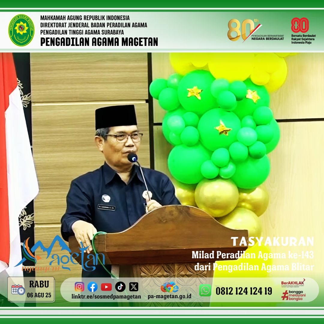 Magetan | pa-magetan.go.id | Rabu (6/8/2025) Dalam rangka memperingati Milad Peradilan Agama yang ke 143, Pengadilan Agama Magetan ikut serta dalam memeriahkan acara tasyakuran yang dilaksanakan oleh Pengadilan Agama Blitar melalui live streaming Youtube. Acara berlangsung khidmat dan penuh kekeluargaan. Kegiatan ini dilaksanakan di ruang Candi Panataran Lt. 3 Kantor Bupati Blitar dan dihadiri oleh Ketua Pengadilan Tinggi Agama (KPTA) Surabaya dan jajarannya, Bupati Blitar dan jajarannya, Walikota Blitar dan jajarannya, Ketua PA Sekarisidenan Kediri, Panitera dan Sekretaris Sekarisidenan Kediri, Forkopimda Kabupaten Blitar, dan seluruh tamu undangan. Acara tasyakuran diawali dengan doa bersama dan pembacaan ayat-ayat suci Al-Quran yang bacakan oleh Ustad Shohib Abidin, sebagai bentuk rasa terima kasih atas bertambahnya usia lembaga Peradilan Agama yang telah memberikan pelayanan hukum kepada masyarakat dengan profesional dan berintegritas.
