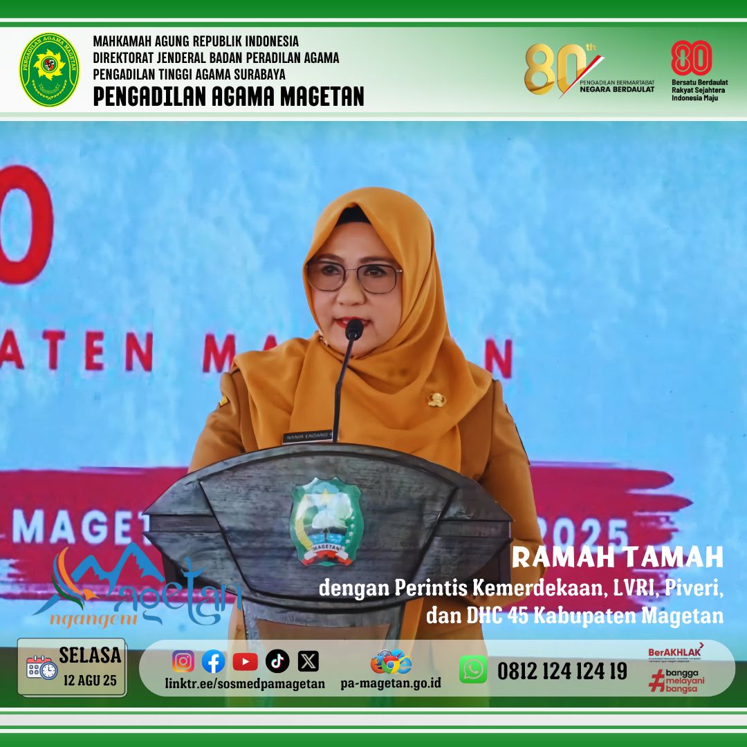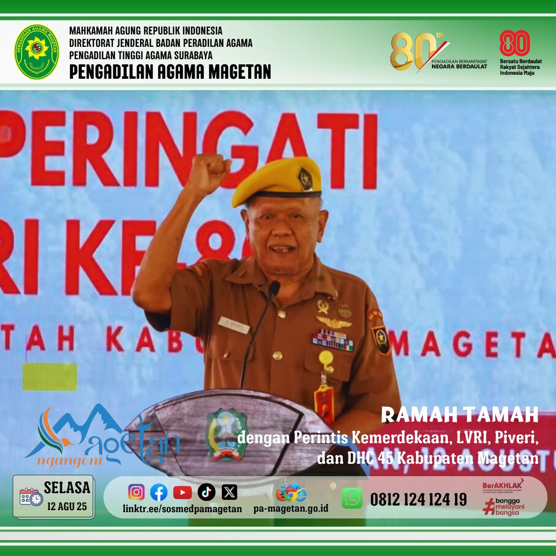 Magetan | pa-magetan.go.id | Selasa (12/8/2025) Pengadilan Agama Magetan menghadiri acara Ramah Tamah dengan para perintis kemerdekaan,LVRI, PIVERI, dan DHC yang bertempat di Pendopo Surya Graha, Magetan. Kegiatan ini dihadiri oleh Bupati Magetan, jajaran TNI-Polri, Pj. Sekda, Asisten, Staf Ahli, OPD terkait, persatuan Wredhatama, dan tokoh penting kemerdekaan. Dalam sambutannya, Ketua LVRI (Legiun Veteran Republik Indonesia) Magetan Sayuti menyampaikan “NKRI, UUD 1945, Bendera Merah Putih, dan Bhinneka Tunggal Ika adalah harga mati yang tidak boleh ditinggalkan.’’ Hal tersebut untuk mengingatkan generasi penerus akan pentingnya menjaga persatuan dan kesatuan bangsa.
