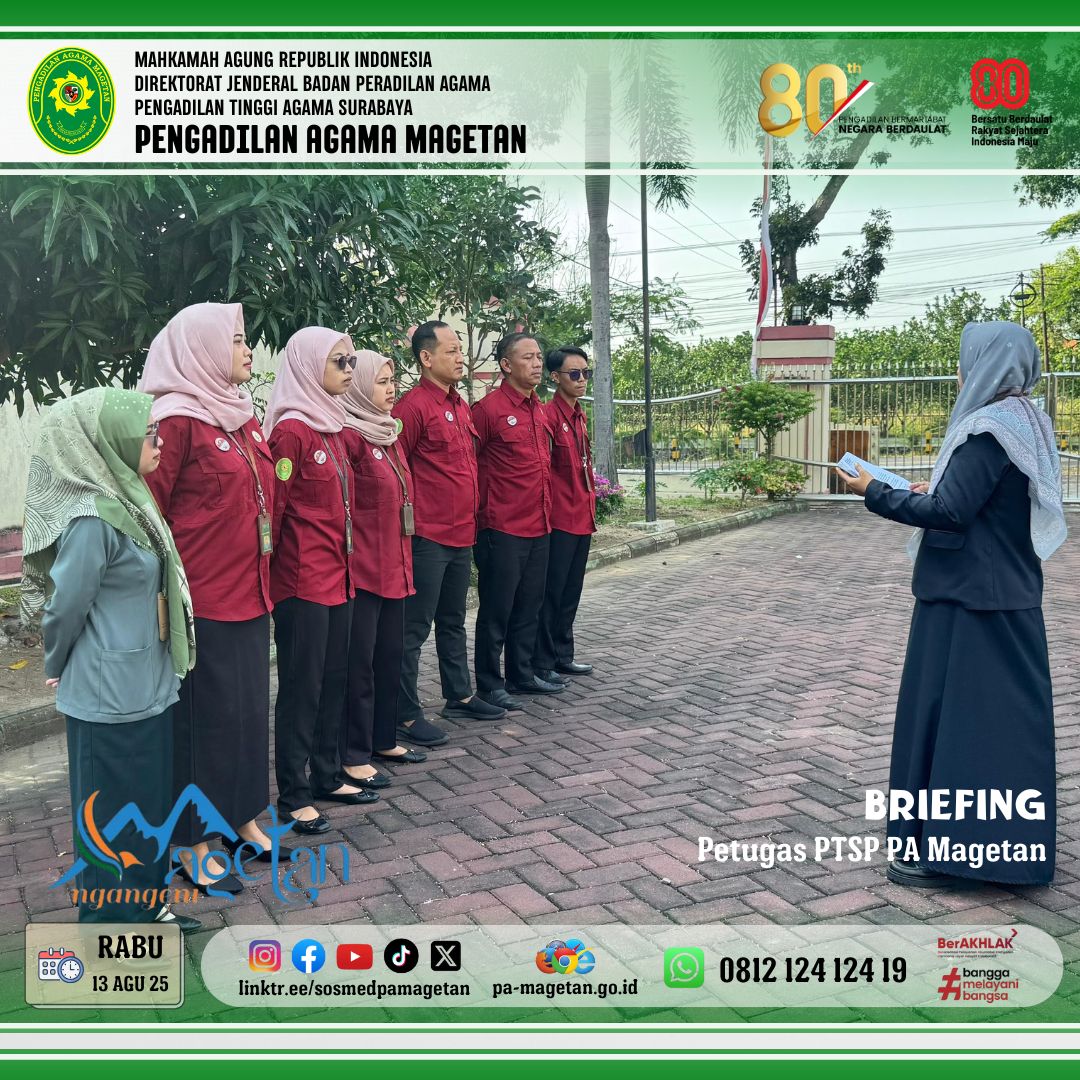 Magetan | pa-magetan.go.id | Pada Rabu (13/08/2025), petugas Pelayanan Terpadu Satu Pintu (PTSP) Pengadilan Agama Magetan mengikuti briefing yang dipimpin langsung oleh Panitera, Ibu Hj. Nilna Niamatin, S.Ag., M.H. Kegiatan ini dilaksanakan setelah melaksanakan Morning Briefing dengan tujuan memberikan arahan dan evaluasi terhadap pelayanan yang telah berjalan. Seluruh petugas PTSP hadir lengkap untuk menyimak instruksi dan saran yang disampaikan. Briefing berlangsung dalam suasana serius namun tetap komunikatif.