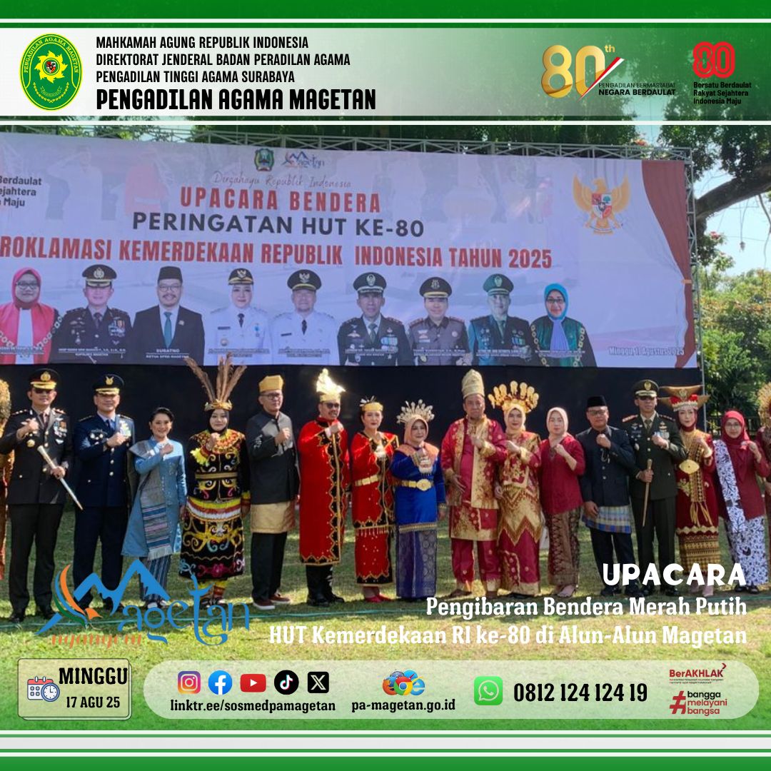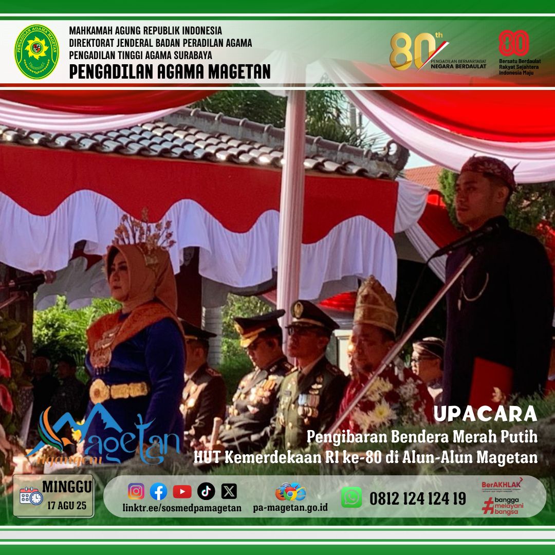 Minggu, (17/08/2025). [pa-magetan.go.id ] Bertempat di Alun-Alun Kabupaten Magetan, dilaksanakan Upacara Pengibaran Bendera Merah Putih dalam rangka peringatan Hari Ulang Tahun Kemerdekaan Republik Indonesia yang ke-80 tahun 2025 pada hari Minggu (17/8). Upacara tersebut diikuti oleh Bupati Magetan, Forkopimda, Sekda Kab Magetan, seluruh Kepala OPD, BUMD, TNI/Polri serta siswa siswi SMA sederajat di Magetan. Pengadilan Agama Magetan diwakili oleh Ketua YM. Dr. Hermin Sriwulan, S.H.I., S.H., M.H.I.