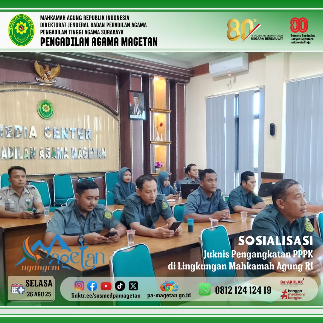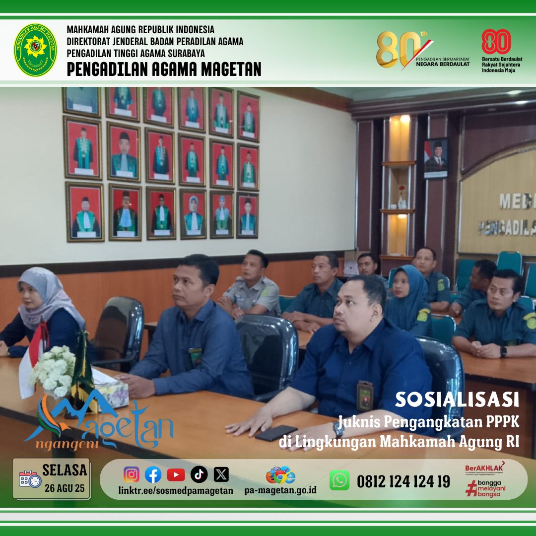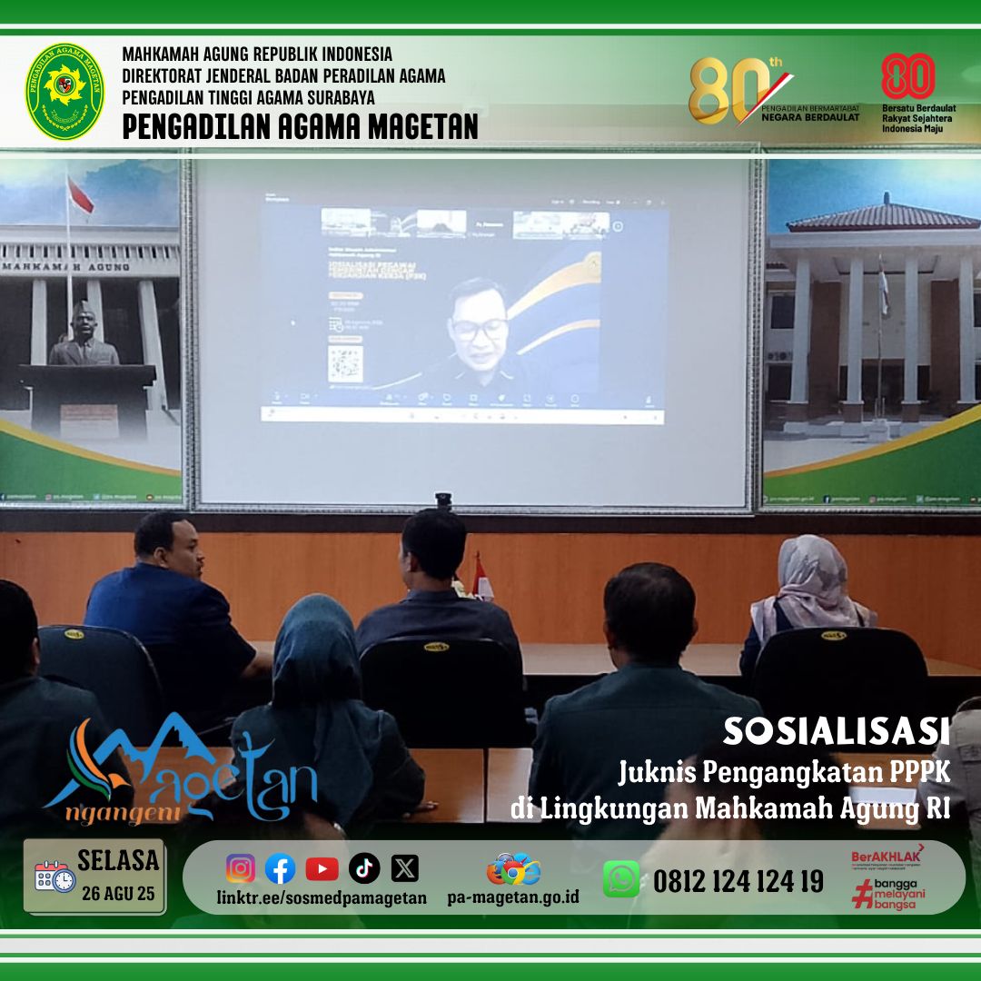Magetan | pa-magetan.go.id | PA Magetan Mengikuti Sosialisasi Teknis Pengangkatan bagi para Pegawai Pemerintah dengan Perjanjian Kerja (PPPK) di Lingkungan Mahkamah Agung Republik Indonesia. Bertempat di Ruang Media Center Pengadilan Agama Magetan melalui Zoom Meeting, pada hari Selasa (26/08/2025) dilaksanakan kegiatan sosialisasi Teknis Pengangkatan bagi para PPPK di Lingkungan Mahkamah Agung Republik Indonesia. Dalam Sosialisasi ini Pengadilan Agama Magetan dihadiri oleh Plt. Sekretaris Bapak Ria Eko Wahyudi, S.Kom, Kasubbag Umum dan Keuangan Bapak Antoni Windika, Kasubbag Kepegawaian dan Ortala Ibu Ipuk Rindiastuti, S.Kom serta para PPPK di Pengadilan Agama Magetan. Acara ini dibuka secara resmi oleh Kepala Biro Kepegawaian, Bapak Sahlanudin, S.Ag., SH., M.H., yang dalam sambutannya menekankan pentingnya peran strategis PPPK dalam mendukung kinerja lembaga peradilan. Beliau juga berpesan agar para PPPK dapat segera beradaptasi dengan lingkungan kerja dan menunjukkan integritas serta profesionalisme yang tinggi dalam menjalankan tugasnya.