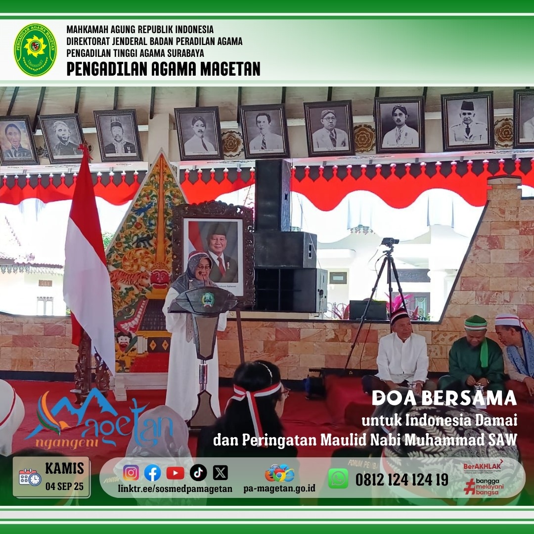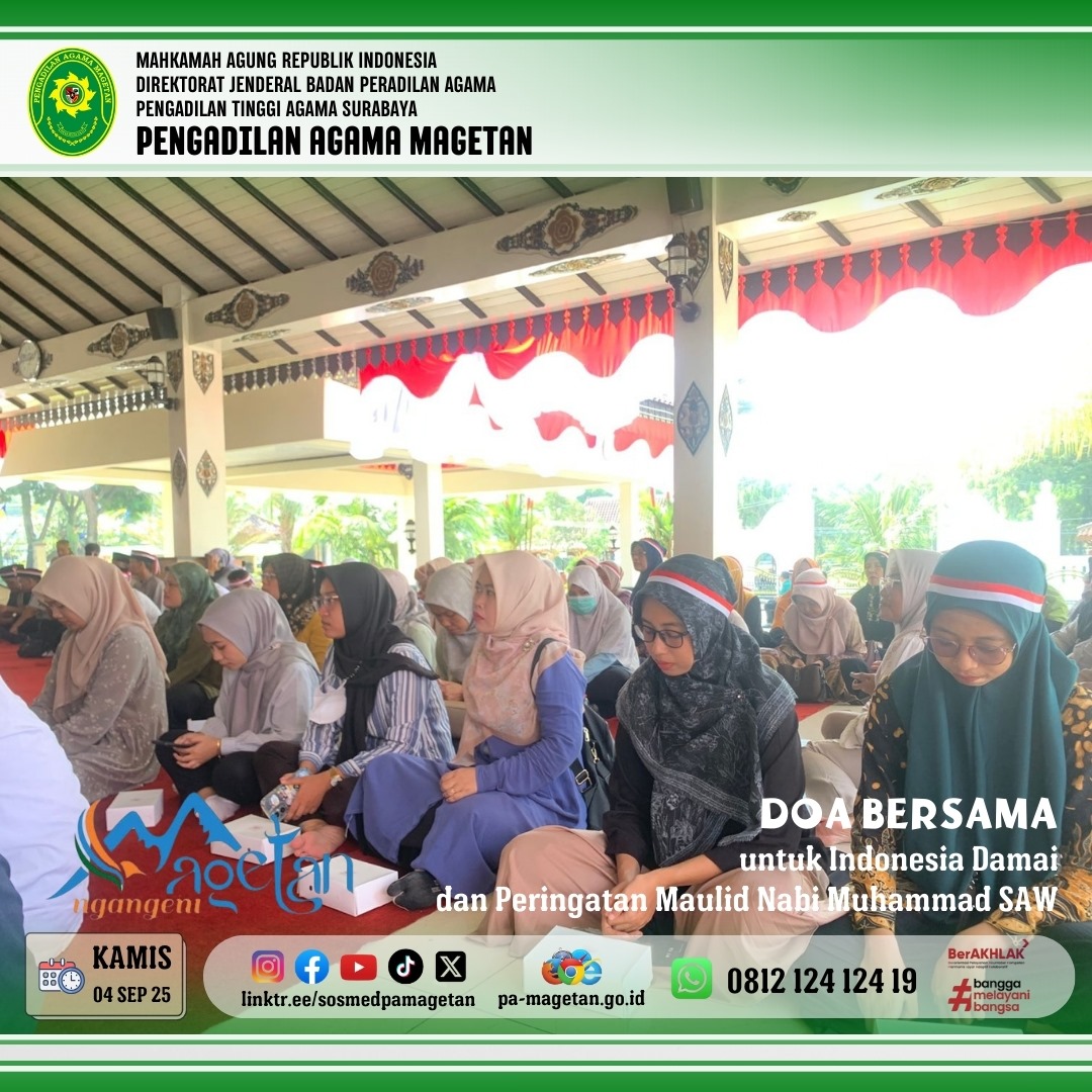 Magetan | pa-magetan.go.id | Bertempat di Pendopo Surya Graha Magetan, dilaksanakan kegiatan Doa Bersama untuk Indonesia Damai sekaligus Peringatan Maulid Nabi Muhammad SAW 1447 H/2025 M. Acara ini dihadiri oleh Forkopimda Kabupaten Magetan, tokoh agama, organisasi masyarakat, dan Pengadilan Agama Magetan diwakili oleh Uswatul Fikriyah, S.H.I, M.H.serta berbagai elemen masyarakat. Doa bersama dipanjatkan demi terwujudnya persatuan, keselamatan, dan keberkahan bangsa Indonesia. Suasana religius dan penuh kebersamaan terasa sepanjang acara.