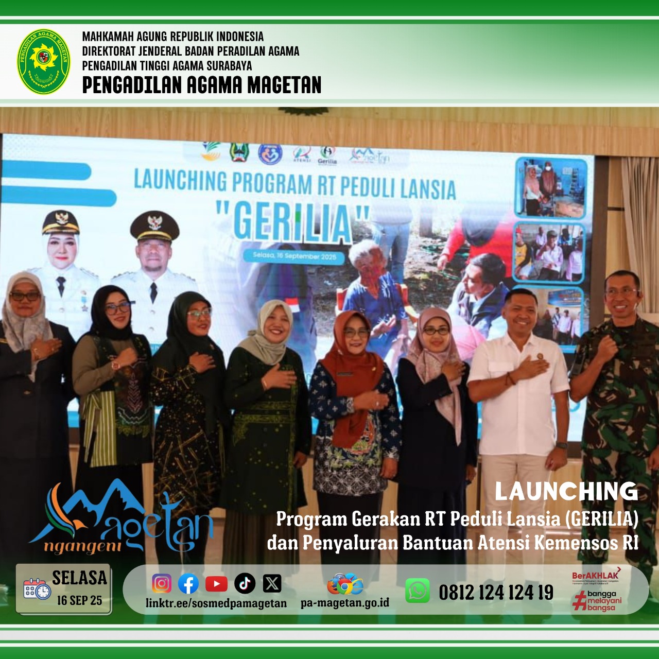 Magetan | pa-magetan.go.id | Selasa (16/9/2025) Pemerintah Daerah Kabupaten Magetan menggelar launching Program Gerakan RT Peduli Lansia (Gerilia) dan Penyaluran Bantuan sosial Atensi Kemensos RI yang bertempat di pendopo surya graha. Acara dihadiri oleh Dr. Hermin Sriwulan, S.H.I.,S.H.,M.H.I sebagai perwakilan Pengadilan Agama Magetan, Bupati, wakil bupati Magetan, KA. Sentra Terpadu Kartini Temanggung, PJ Sekdakab, Asisten dan Staf Ahli, Ka.Opd terkait serta para penerima bantuan. Acara tersebut diawali dengan laporan dan pemaparan program yang disampaikan oleh Kepala Dinas Sosial. Kepala Sentra Terpadu Kartini Temanggung turut memberikan sambutan yang menekankan pentingnya semangat kolaborasi untuk mendukung kesejahteraan lansia.