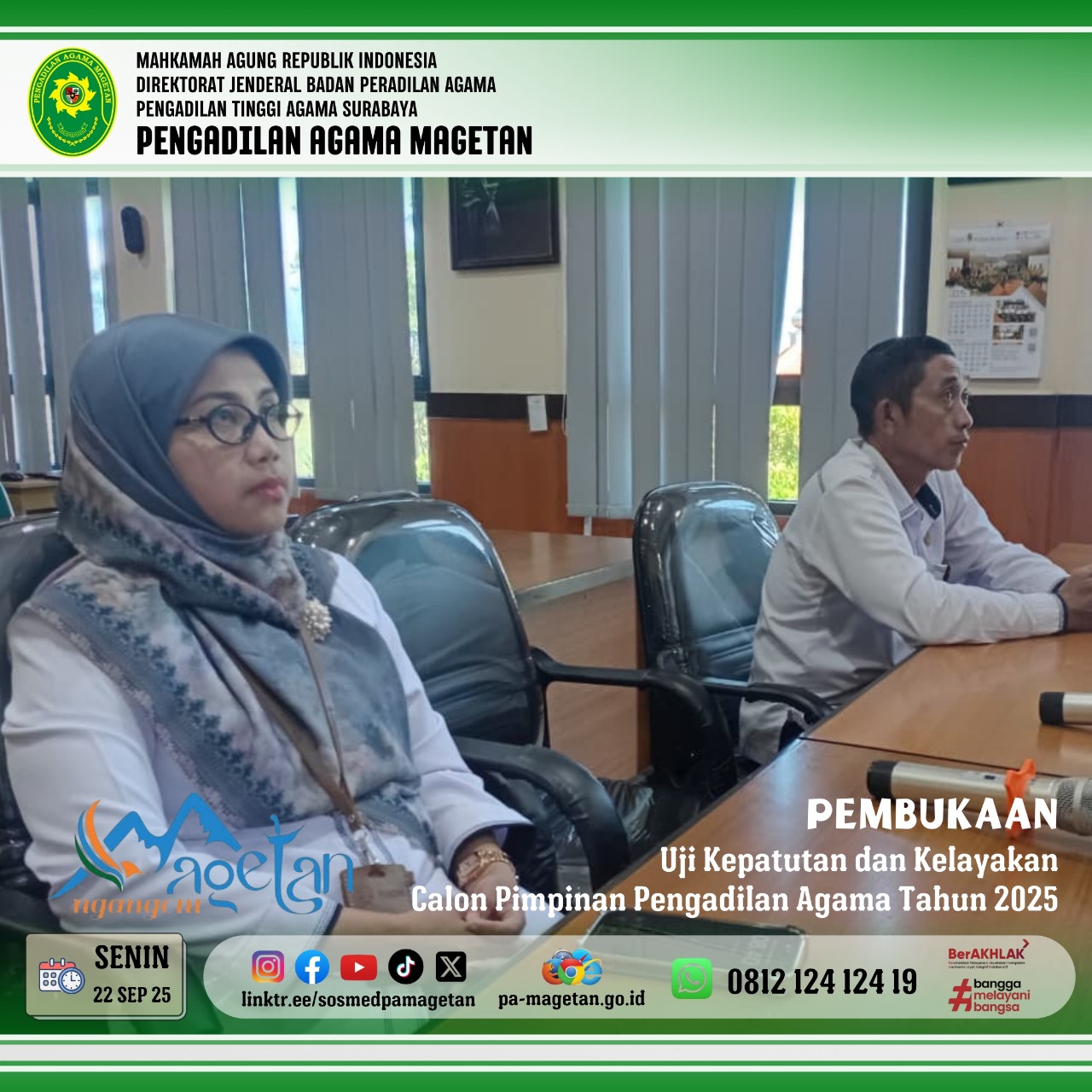 Magetan | pa-magetan.go.id | Direktorat Jenderal Badan Peradilan Agama mengadakan upacara pembukaan kegiatan Uji Kepatuhan dan Kelayakan (Fit and Proper Test) calon pimpinan pengadilan di lingkungan Peradilan Agama tahun 2025. Acara tersebut dilaksanakan secara virtual melalui aplikasi Zoom pada Senin, 22 September 2025, pukul 08.00 WIB. Upacara ini dihadiri oleh Dirjen Badilag MA, Pimpinan Pengadilan Tingkat Banding, Pimpinan Pengadilan Tingkat Pertama, para Penguji, dan Peserta dari pengadilan agama. Hadir pula Ketua Pengadilan Agama Magetan Dr. Hermin Sriwulan, S.H.I., S.H., M.H.I. dan Luqman Hariyadi, S.H., M.H., sebagai hakim/peserta yang mengikuti fit and proper test.
