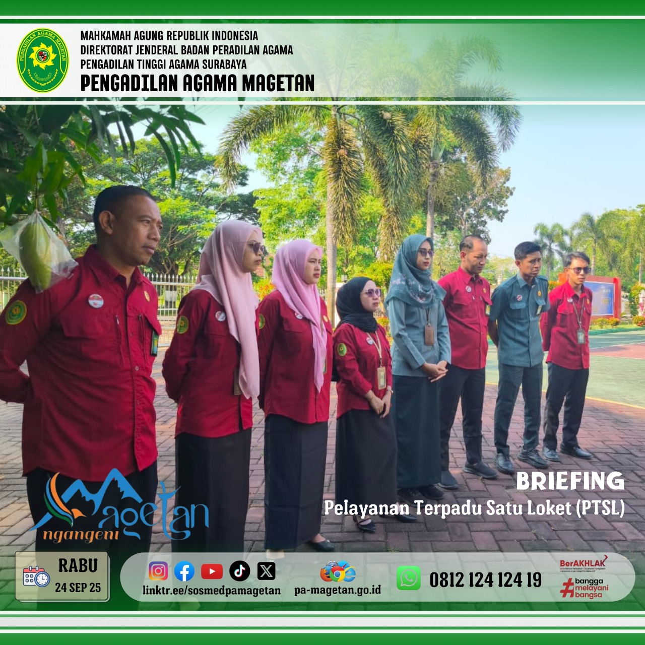Magetan | pa-magetan.go.id |Pada hari Rabu (24/09/2025), petugas Pelayanan Terpadu Satu Loket (PTSL) melaksanakan briefing rutin setelah melaksanaan Morning Briefing. Kegiatan ini dipimpin oleh Panitera Ibu Hj. Nilna Niamatin, S.Ag, M.H., yang memberikan arahan penting kepada seluruh petugas. Briefing tersebut bertujuan untuk meningkatkan profesionalisme serta koordinasi dalam pelayanan kepada masyarakat. Seluruh petugas diwajibkan hadir tepat waktu guna menerima instruksi yang disampaikan.