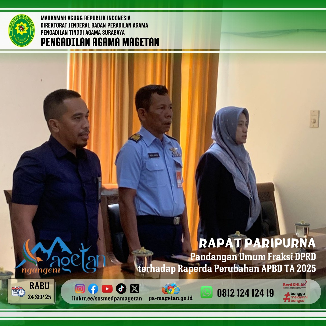 Magetan | pa-magetan.go.id – Dewan Perwakilan Rakyat Daerah (DPRD) Kabupaten Magetan menyelenggarakan rapat paripurna dengan agenda Pandangan Umum Fraksi DPRD terhadap Raperda Perubahan APBD Tahun Anggaran 2025 pada Rabu (24/09/2025). Kegiatan berlangsung di Ruang Rapat Paripurna DPRD Kabupaten Magetan mulai pukul 10.00 WIB. Pengadilan Agama Magetan turut hadir dalam acara tersebut yang diwakili oleh Panitera, Hj. Nilna Niamatin, S.Ag., M.H. Kehadiran beliau merupakan bentuk dukungan dalam rangka sinergi antar lembaga.