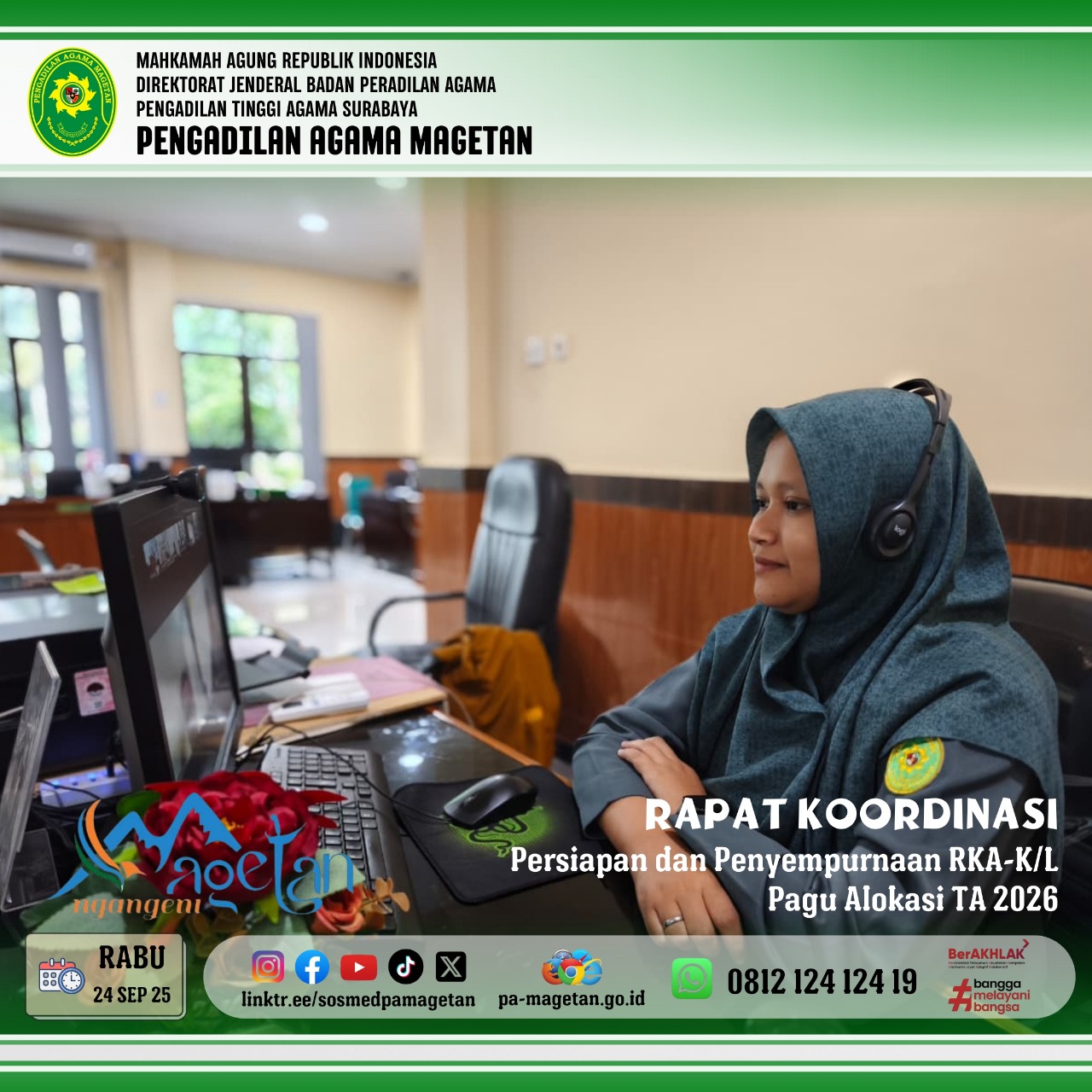 Magetan | pa-magetan.go.id | – Plt. Sekretaris Pengadilan Agama Magetan, Ria Eko Wahyudi, S.Kom., yang diwakili oleh Klerek Penelaah Teknis Kebijakan, Titin Oktaviani, S.IAN, mengikuti Rapat Persiapan dan Penyempurnaan Penyusunan RKA-K/L Pagu Alokasi Tahun Anggaran 2026. Kegiatan tersebut dilaksanakan secara daring pada hari Rabu (24/09/2025) pukul 13.30 WIB. Rapat dipimpin oleh Kepala Biro Perencanaan dan Organisasi Badan Urusan Administrasi Mahkamah Agung RI, H. Sahwan, S.H., M.H. serta diikuti oleh seluruh satuan kerja Pengadilan Tingkat Banding dan Tingkat Pertama di empat lingkungan peradilan se-Indonesia.