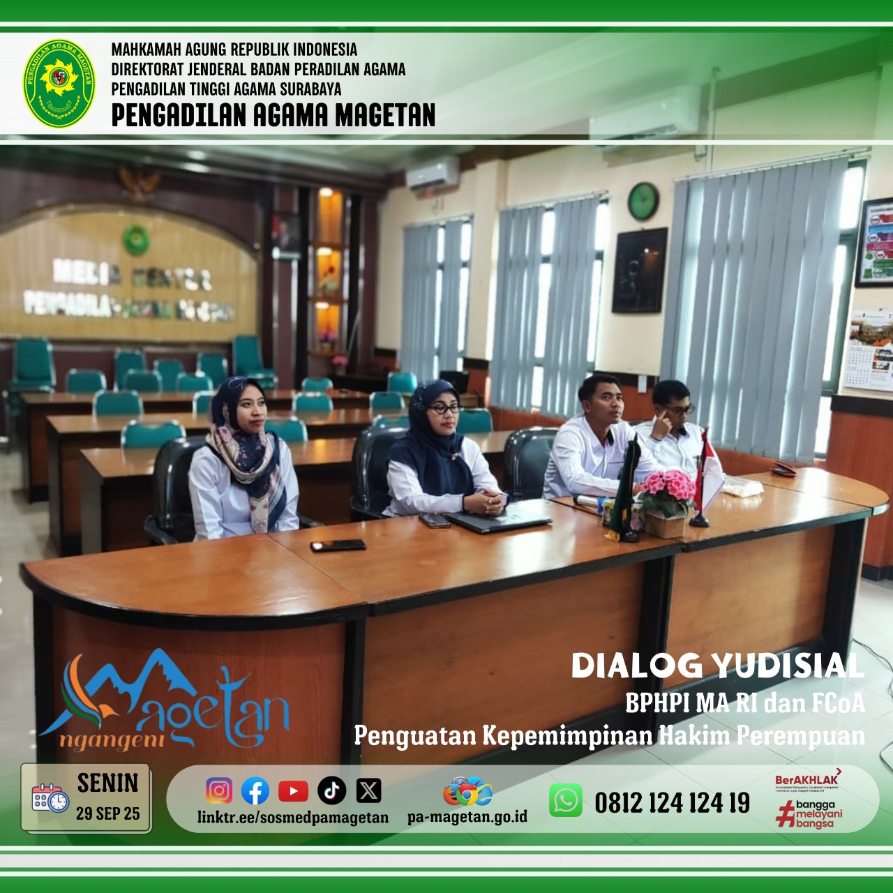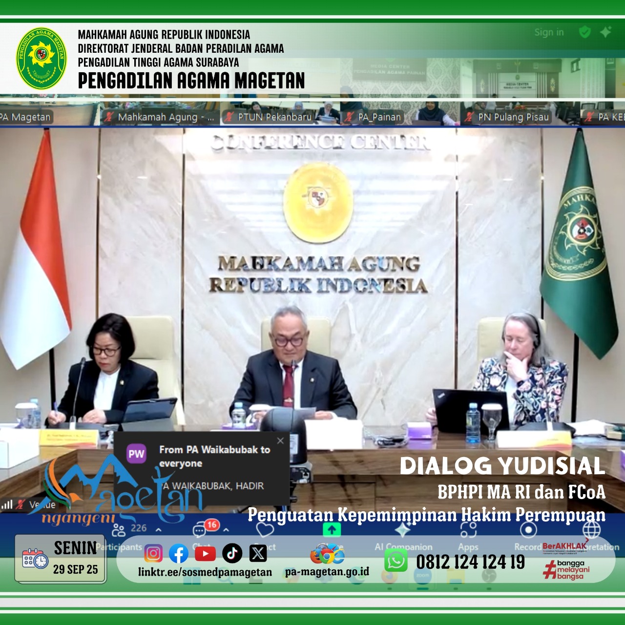 Magetan | pa-magetan.go.id | Senin, 29 September 2025, digelar forum Zoom yang bertema inspirasi dan penguatan kepemimpinan hakim perempuan. Acara ini diselenggarakan oleh BPHPI yang lahir dari semangat kesetaraan di lingkungan peradilan Indonesia. Pengadilan Agama Magetan turut serta dalam acara ini, yang mana dihadiri oleh Ibu Ketua Dr. Hermin Sriwulan, S.H.I., S.H., M.H.I., dan para hakim yaitu Ibu Uswatul Fikriyah, S.H.I., M.H., Bapak Helmy Ziaul Fuad, S.H.I., S.H., M.H.,, dan Bapak Rofi' Almuhlis, S.H.I.. Para peserta mengikuti paparan sejarah BPHPI dengan antusias untuk memahami bagaimana organisasi ini terbentuk dan berkembang.