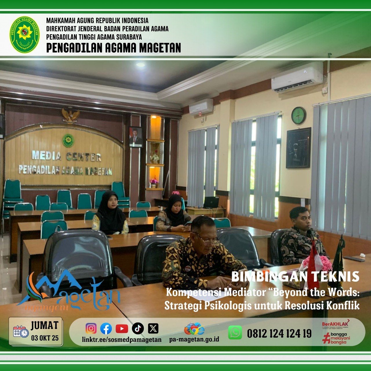 Magetan | pa-magetan.go.id| Pada hari Jumat, tanggal 03 Oktober 2025, para Hakim Pengadilan Agama Magetan mengikuti kegiatan bimbingan teknis peningkatan kompetensi mediator. Kegiatan ini dilaksanakan secara daring mulai pukul 08.00 WIB dan berlokasi di Media Center Pengadilan Agama Magetan. Bimbingan teknis tersebut diselenggarakan sebagai bentuk upaya peningkatan kemampuan para hakim dalam melaksanakan fungsi mediasi di lingkungan peradilan agama. Kegiatan ini diikuti dengan antusias oleh seluruh peserta yang hadir.