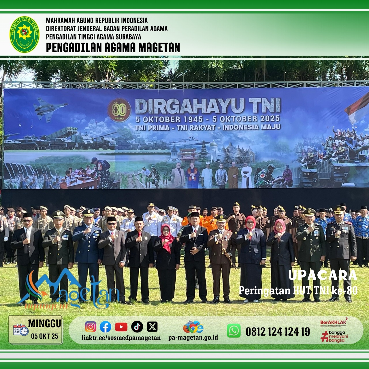 Magetan | pa-magetan.go.id | Upacara peringatan Hari Ulang Tahun (HUT) ke-80 Tentara Nasional Indonesia (TNI) di Kabupaten Magetan berlangsung khidmat dan meriah. Upacara peringatan dipusatkan di Alun-Alun Magetan pada Minggu, 5 Oktober 2025, dengan mengusung tema "TNI Prima, TNI Rakyat, Indonesia Maju." Forkopimda Magetan kompak hadir dalam acara tersebut. Pengadilan Agama Magetan diwakili oleh Hakim Ibu Miftakul Khoriyah, S.H.I., M.H.
