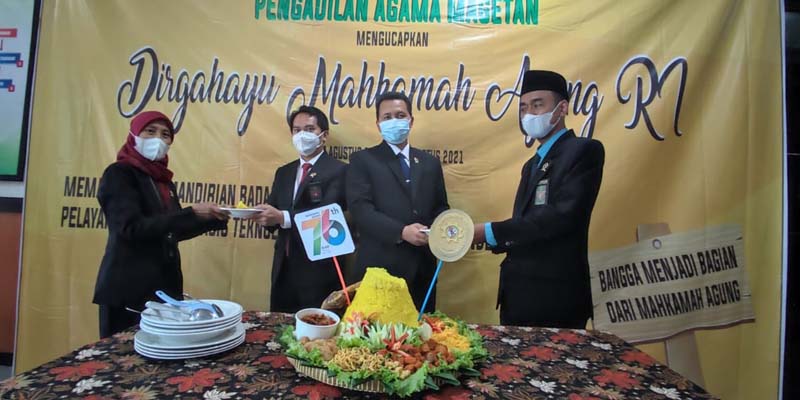 Rangkaian peringatan HUT ke-76 Mahkamah Agung Republik Indonesia diakhiri dengan potong tumpeng oleh Ketua dan Wakil Ketua Pengadilan Agama Magetan.