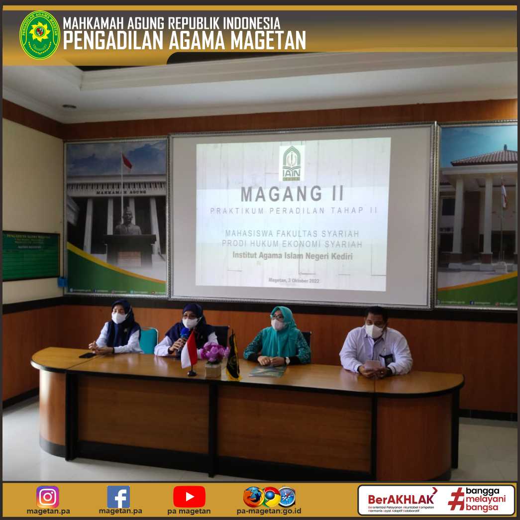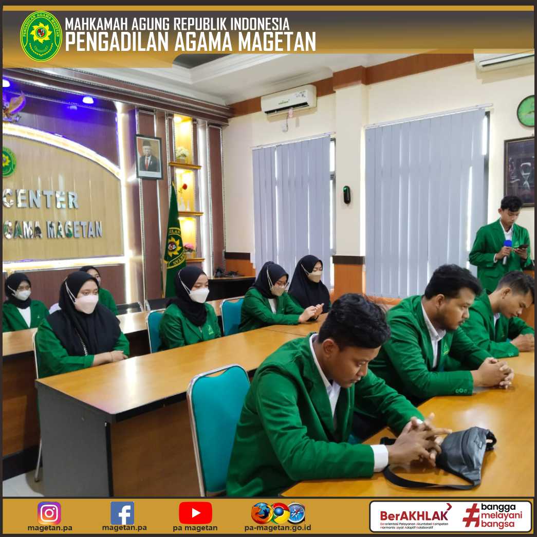 Magetan | pa-magetan.go.id | Pengadilan Agama Magetan melaksanakan Pembukaan Magang II Praktikum Peradilan Tahap II Mahasiswa Fakultas Syariah Program Studi Hukum Ekonomi Syariah Institut Agama Islam Negeri Kediri. Acara Pembukaan ini dihadiri oleh Ketua, Wakil Ketua, Panitera dan Dosen Pamong Pengadilan Agama Magetan serta Dosen Pembimbing Mahasiswa Institut Agama Islam Negeri Kediri yang dilaksanakan di Media Center Pengadilan Agama Magetan.