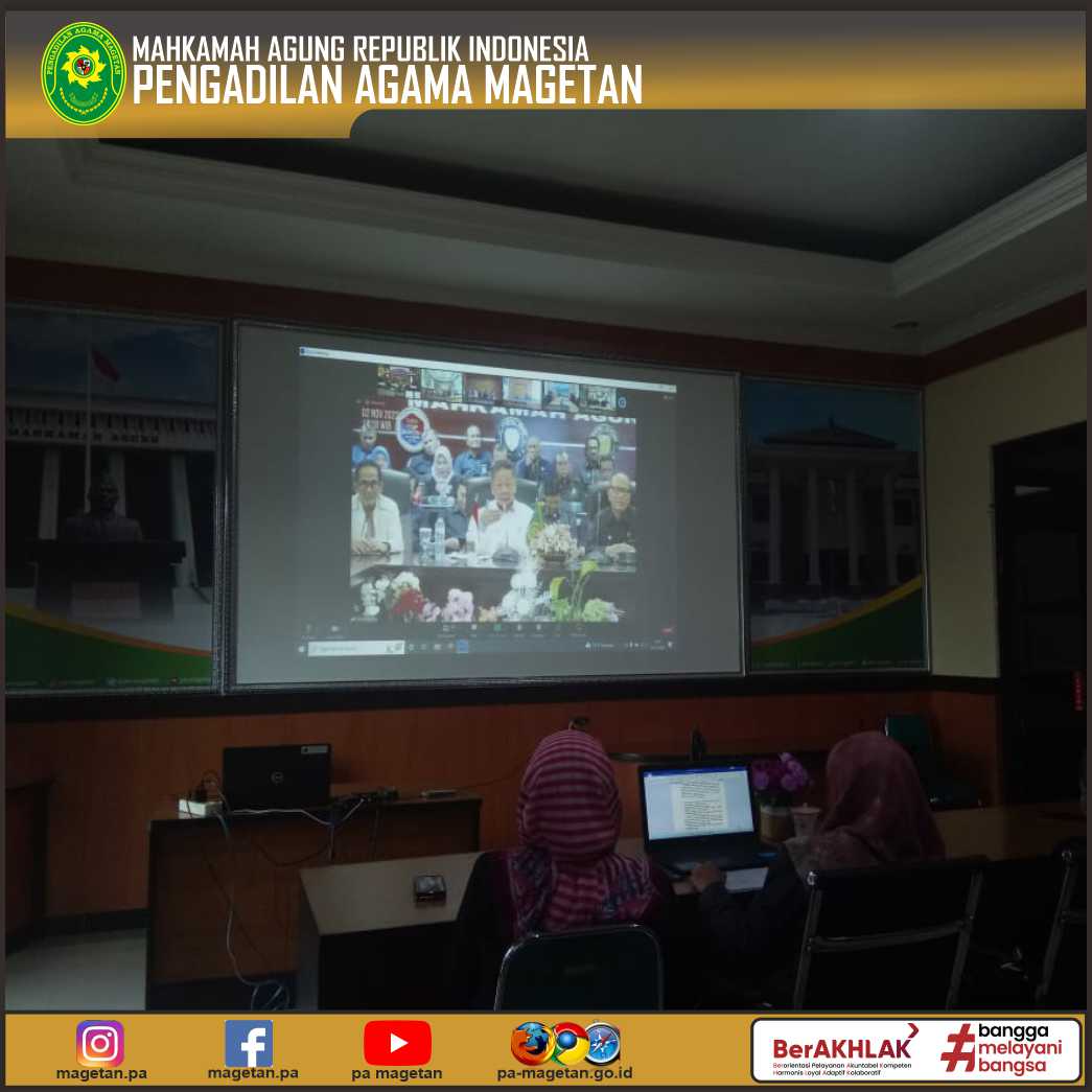 Magetan | pa-magetan.go.id | Pengadilan Agama Magetan yang diwakili oleh Ketua, Wakil Ketua, Panitera, Sekretaris dan Para Hakim mengikuti Acara Launching Aplikasi secara online dari Media Center Pengadilan Agama Magetan.