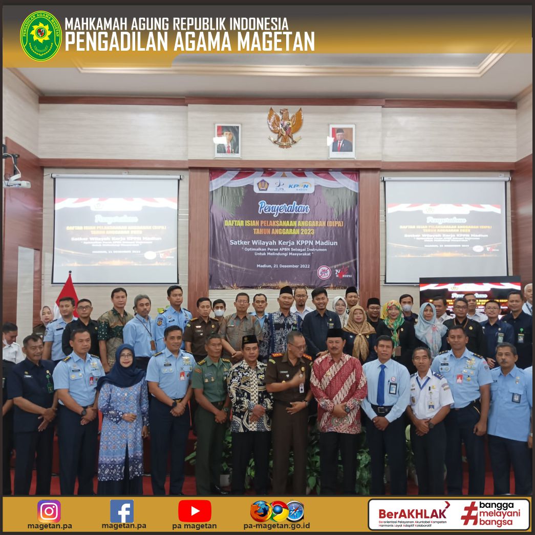 Magetan | pa-magetan.go.id | Pengadilan Agama Magetan yang diwakili oleh Sekretaris (St. Mar’atu Ulfah, S.Ag) menghadiri Penyerahan DIPA Tahun Anggaran 2023 yang dilaksanakan di KPPN Madiun.