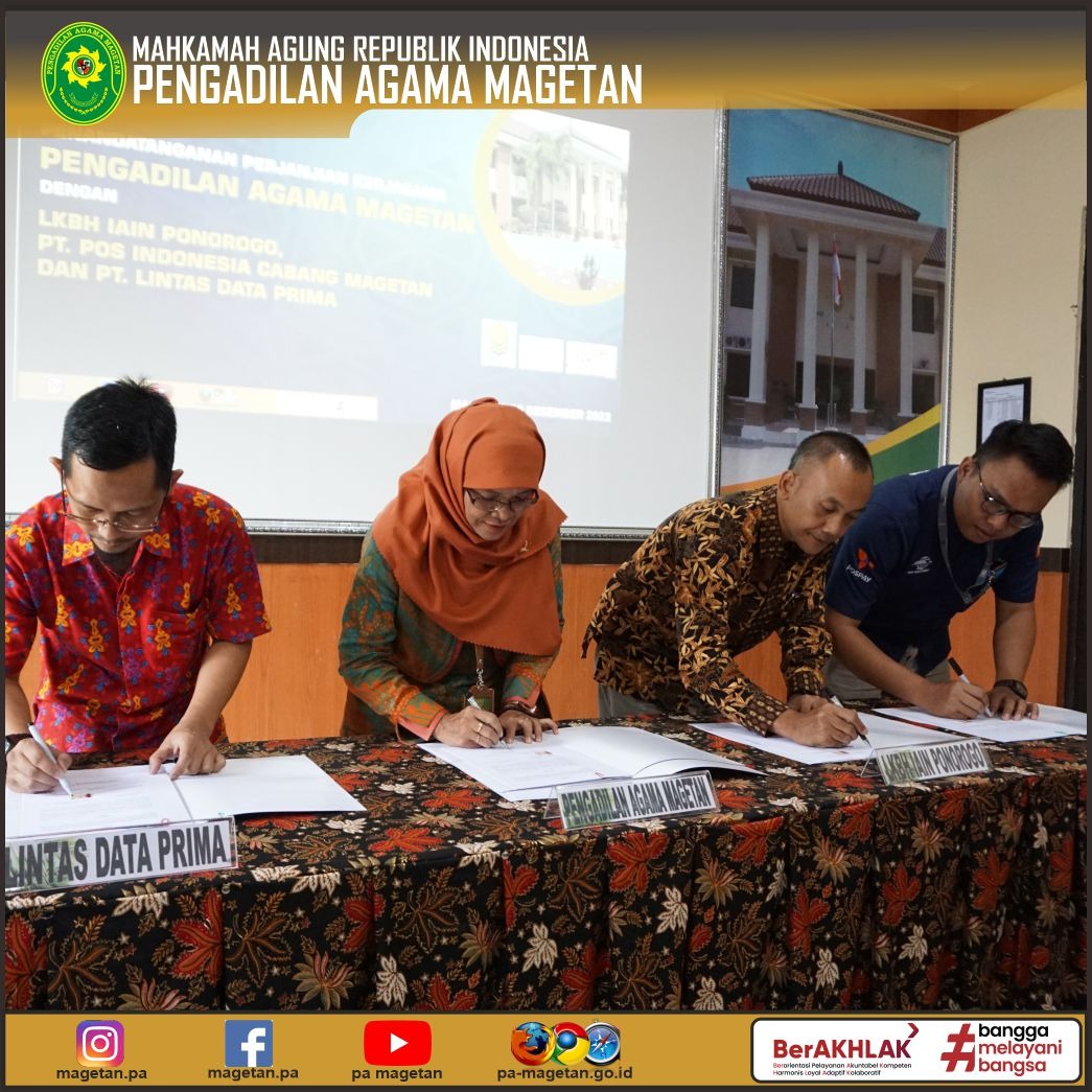 Magetan | pa-magetan.go.id | Pengadilan Agama Magetan melaksanakan Penandatanganan Perjanjian Kerjasama Dengan LKBH IAIN Ponorogo, PT. Pos Indonesia Cabang Magetan dan PT. Lintas Data Prima yang dilaksanakan di Media Center Pengadilan Agama Magetan.