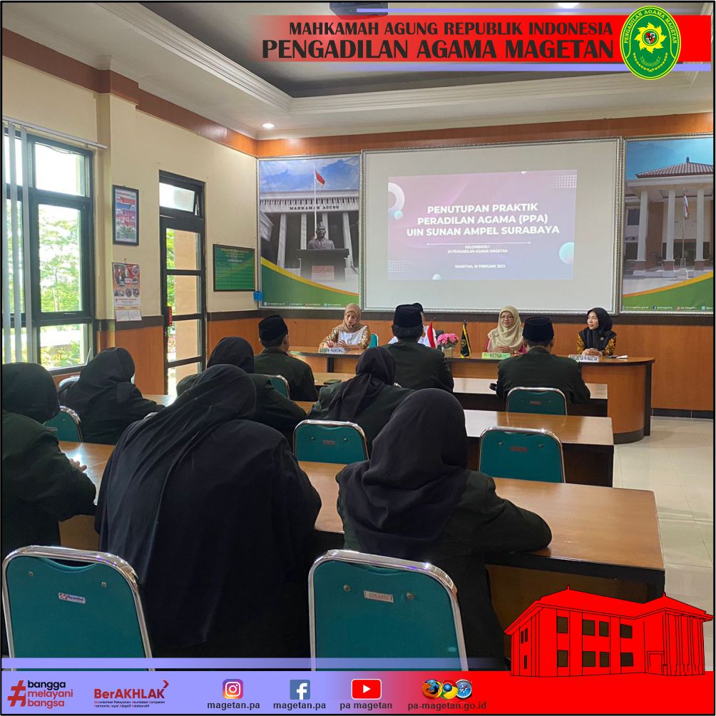 Magetan | pa-magetan.go.id | Pengadilan Agama Magetan melaksanakan Penutupan Praktik Peradilan Agama (PPA) Program Studi Hukum Fakultas Syariah dan Hukum UIN Sunan Ampel Surabaya di Media Center Pengadilan Agama Magetan. Kegiatan yang dihadiri oleh Ketua Pengadilan Agama Magetan (YM. Hj. Yurita Heldayanti, S.Ag., M.H), Wakil Ketua Pengadilan Agama Magetan (YM. Wakhidah, S.H., S.H.I., M.H.), Dosen Pamong (YM. Lusiana Mahmudah, S.H.I, M.H.), Dosen Pembimbing (Drs. Jeje Abdul Rojak, M. Ag.) dan Mahasiswa Program Studi Hukum Fakultas Syariah dan Hukum UIN Sunan Ampel Surabaya.