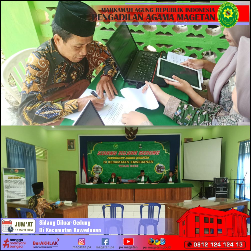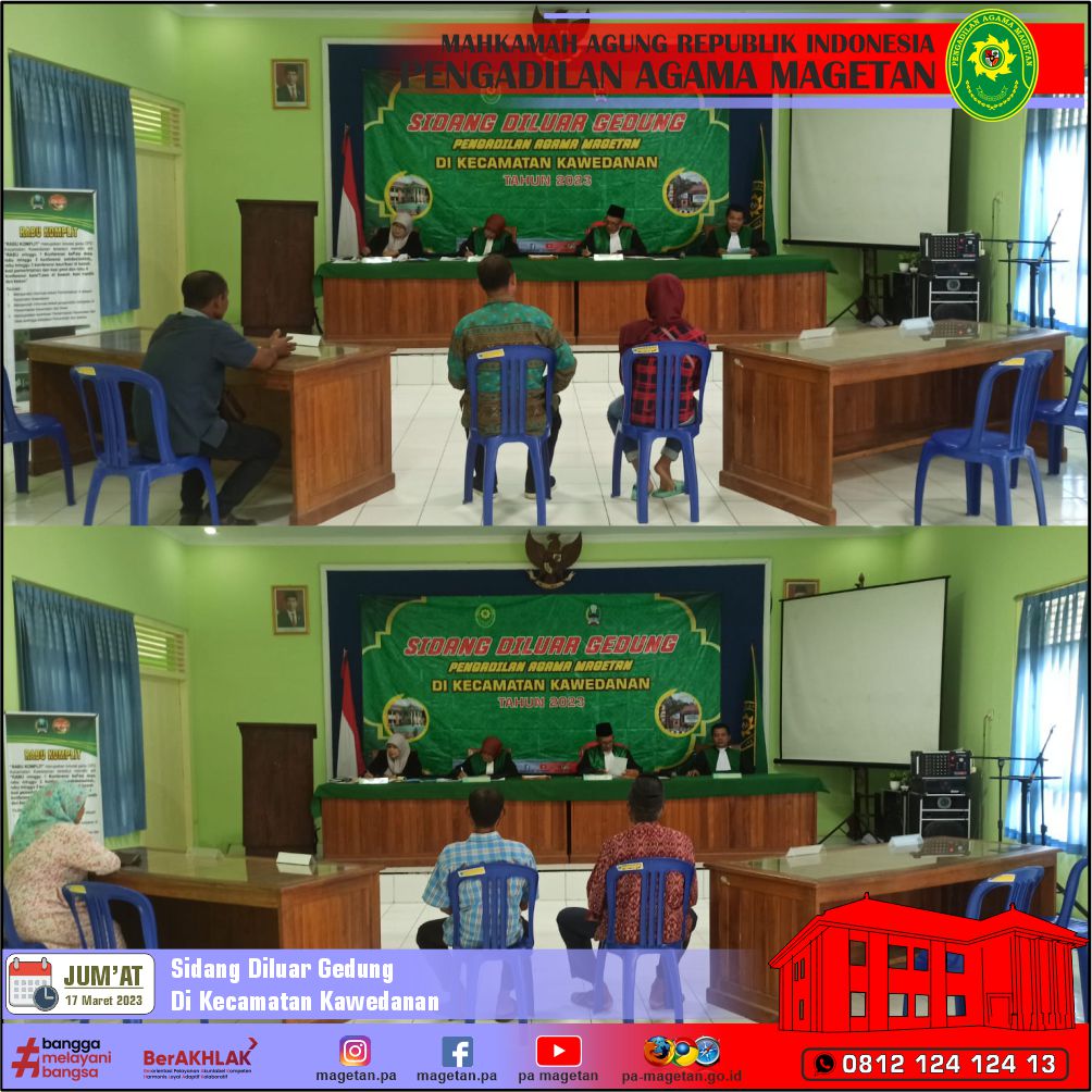 Magetan | pa-magetan.go.id | Pengadilan Agama Magetan kembali melaksanakan kegiatan Sidang di Luar Gedung yang dilaksanakan di Kecamatan Kawedanan. Kegiatan periode ke-2 yang dilaksanakan di Kecamatan Kawedanan ini merupakan kelanjutan pelaksanaan Sidang Diluar Gedung yang telah dilaksanakan pada minggu yang lalu yaitu di tanggal 10 Maret 2023.