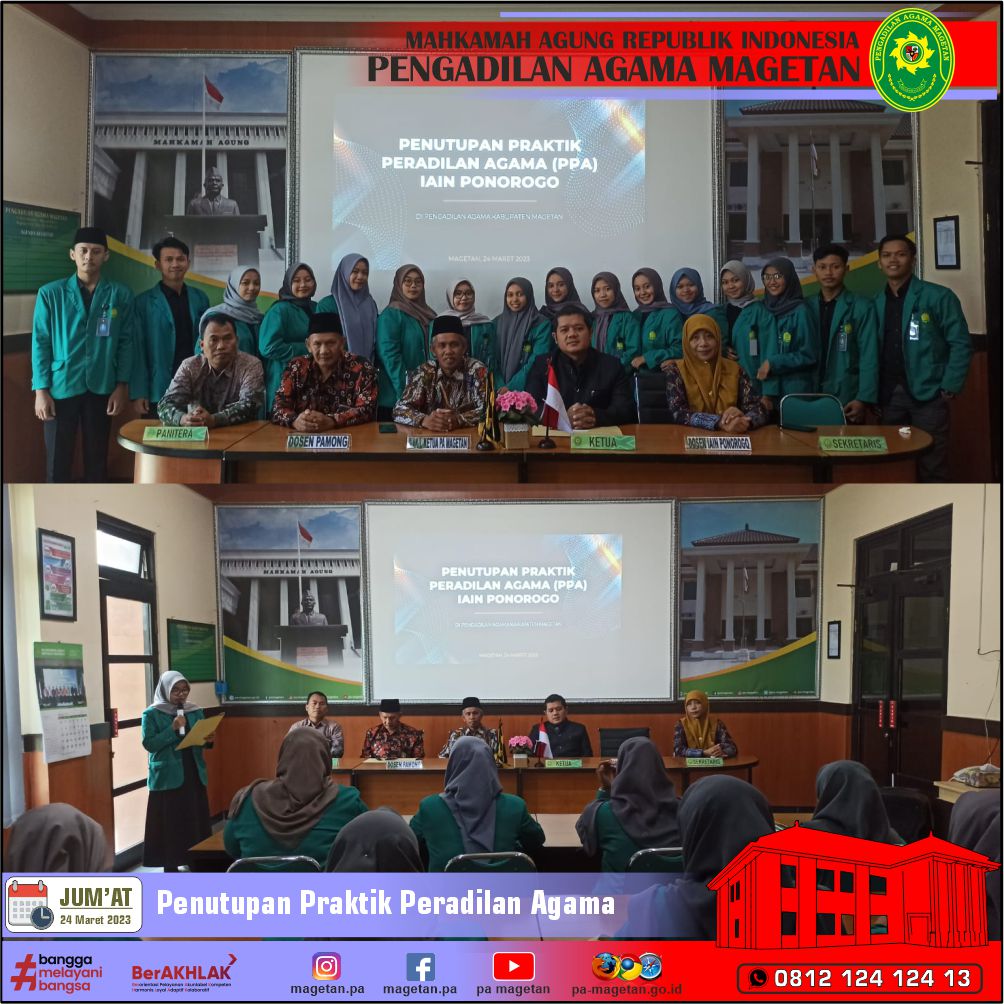 Magetan | pa-magetan.go.id | Pengadilan Agama Magetan melaksanakan Penutupan Praktik Peradilan Agama (PPA) Jurusan Hukum Ekonomi Syariah Fakultas Syariah IAIN Ponorogo di Media Center Pengadilan Agama Magetan. Kegiatan yang dihadiri oleh Ketua Pengadilan Agama Magetan (YM. Makhmud, S.Ag., M.H), Sekretaris, Panitera, Dosen Pamong (Dr. Drs. Sugeng, M.H), Dosen Pembimbing (Achmad Baihaqi, M.H) dan mahasiswa Jurusan Hukum Ekonomi Syariah Fakultas Syariah IAIN Ponorogo.