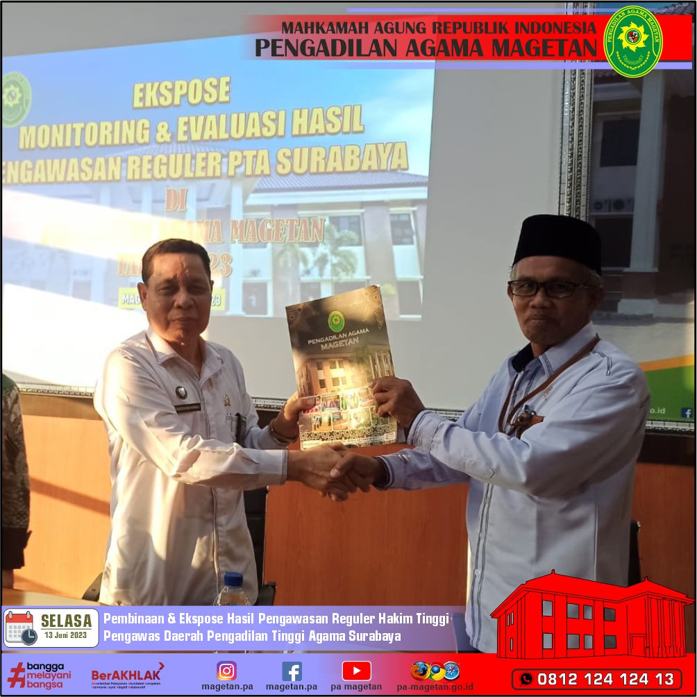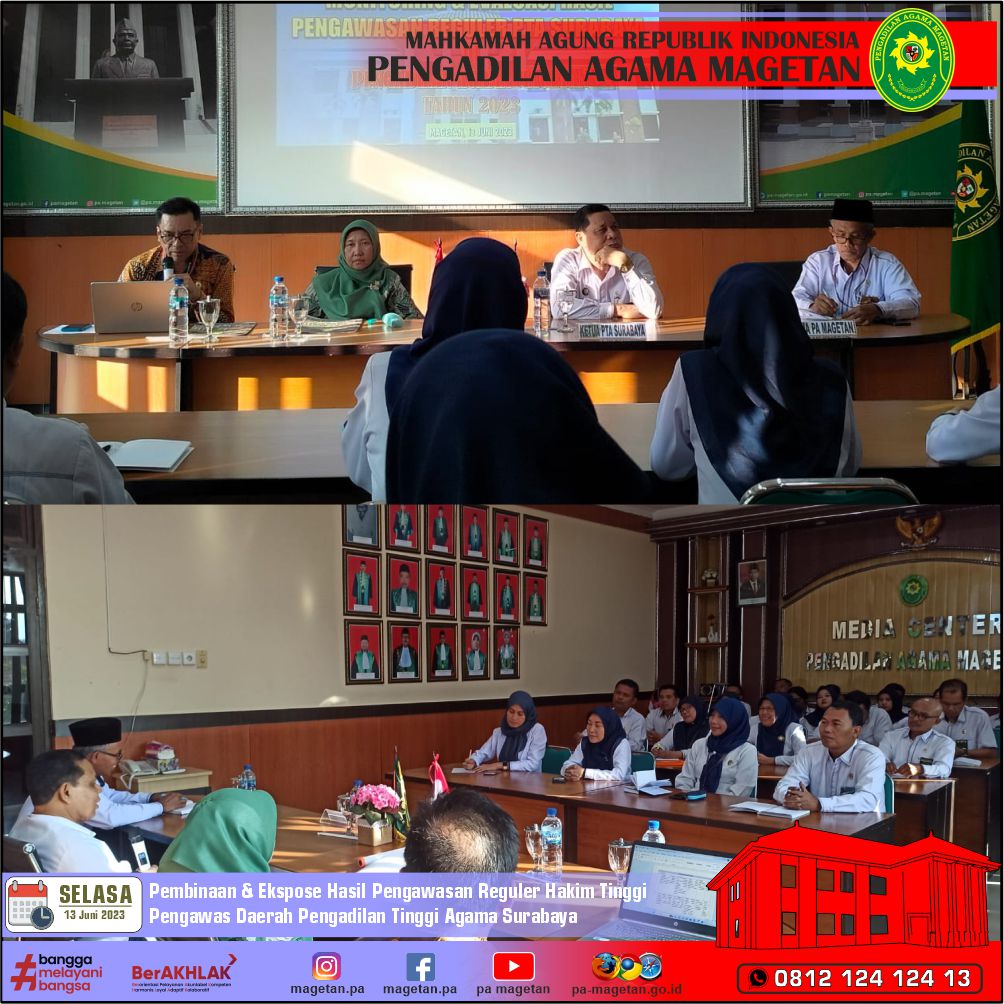 Magetan | pa-magetan.go.id | Pengadilan Agama Magetan melaksanakan kegiatan Ekspose Hasil Pengawasan Reguler Hakim Tinggi Pengawas Daerah Pengadilan Tinggi Agama Surabaya yang dilaksanakan pada tanggal 12 - 13 Juni 2023. Kegiatan yang dihadiri oleh semua pegawai Pengadilan Agama Magetan ini di laksanakan di Media Center Pengadilan Agama Magetan.