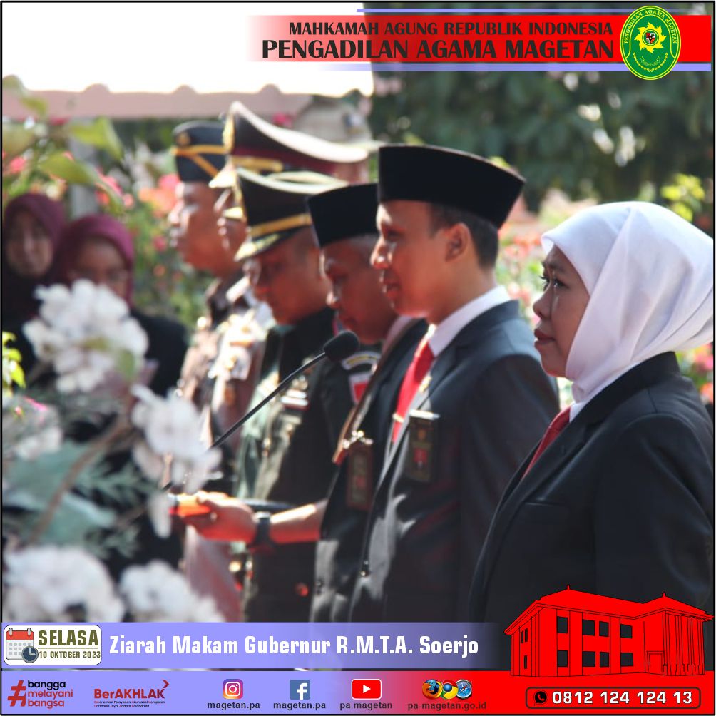 Magetan | pa-magetan.go.id | Ketua Pengadilan Agama Magetan mengikuti kegiatan Ziarah Makam Gubernur R.M.T.A. Soerjo di Jalan Salak, Magetan. Kegiatan ini merupakan salah satu serangkaian kegiatan dalam rangka menyambut Hari Jadi Ke-78 Provinsi Jatim & Hari Jadi Ke - 348 Kabupaten Magetan. Kegiatan ini dipimpin langsung oleh Gubernur Jawa Timur (Dra. Hj. Khofifah Indar Parawansa, M.Si.) dan diikuti oleh Sekdaprov Jatim, para Kepala OPD Pemprov Jatim, Pj Bupati Magetan, Ketua DPRD Kabupaten Magetan, serta Forkopimda Kab. Magetan dan jajaran OPD Kab. Magetan