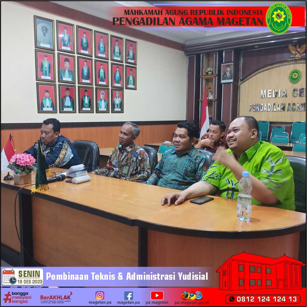 Magetan | pa-magetan.go.id | Pengadilan Agama Magetan diwakili oleh Ketua, Hakim, Panitera, Sekretaris dan Aparatur Pengadilan Agama Magetan mengikuti Pembinaan Bidang Teknis dan Administrasi Yudisial secara online dari Media Center Pengadilan Agama Magetan. Kegiatan yang dilaksanakan dari Hotel The Natsepa Resort & Conference Center Ambon, Jl. Natsepa no.36, Suli, Kec. Salahutu, Kab. Maluku Tengah, Maluku. Kegiatan ini berlangsung selama 2 hari, mulai kemarin (18/12/23) sampai hari ini (19/12/23). Kegiatan ini menindaklanjuti surat undangan Wakil Ketua Mahkamah Agung Bidang Yudisial Nomor: 68/WKMA.Y/UND/XII/2023 tanggal 04 Desember 2023.