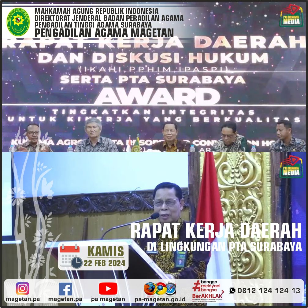Magetan | pa-magetan.go.id | Ketua, Panitera, Sekretaris mengikuti acara Rapat Kerja Daerah dan PTA Surabaya Award yang diadakan oleh Pengadilan Tinggi Agama Surabaya pada hari Rabu s.d. Jumat (21-23 Februari 2024). Kegiatan ini sebagai tindak lanjut Undangan PTA Surabaya nomor 687/KPTA.W13-A/HM1.1.1/1/2024 tanggal 30 Januari 2024. Pelaksanaan Rakerda ini diikuti oleh seluruh Hakim Tinggi Pengadilan Tinggi Agama Surabaya, para Ketua, Panitera, dan Sekretaris Pengadilan Agama seWilayah PTA Surabaya, serta pejabat Struktural dan Fungsional PTA Surabaya bertempat di Kusuma Agrowisata Resort dan Convention Hotel. Rapat Kerja Daerah dan PTA Surabaya Award kali ini mengambil tema "Tingkatkan Integritas untuk Kinerja yang Berkualitas".
