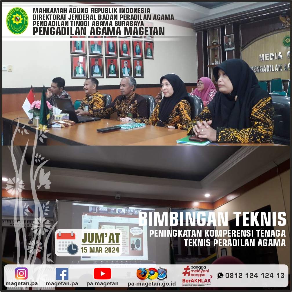 Magetan | pa-magetan.go.id | Ketua, Wakil Ketua, Hakim dan Tenaga Teknis Pengadilan Agama Magetan mengikuti kegiatan Bimtek Peningkatan Kompetensi Tenaga Teknis di Lingkungan Direktorat Jenderal Badan Peradilan Agama dengan tema Evaluasi Implementasi Hasil Pleno Kamar Mahkamah Agung RI dalam Rangka Mewujudkan Kepastian dan Kesatuan Hukum di Lingkungan Peradilan Agama. Kegiatan ini sebagai tindaklanjut dari surat Direktorat Jenderal Badan Peradilan Agama nomor 545/DJA/DL1.10/III/2024 tanggal 07 Maret 2024. Kegiatan ini diikuti oleh seluruh satuan kerja di lingkungan Direktorat Jenderal Badan Peradilan Agama. Bimtek ini dibuka secara langsung oleh Plt. Direktur Jenderal Peradilan Agama (Bambang Hery Mulyono, S.H., M.H.) dengan narasumber Ketua Kamar Agama Mahkamah Agung RI (YM. Prof. Dr. Drs. H. Amran Suadi , S.H., M.Hum., M.M.). Kemudian kegiatan ini juga dimoderatori oleh Panitera Muda/Askor Kamar Agama Mahkamah Agung RI (Dr. Mardi Candra, S.Ag., M.Ag., M.H., CPM., CPArb.).