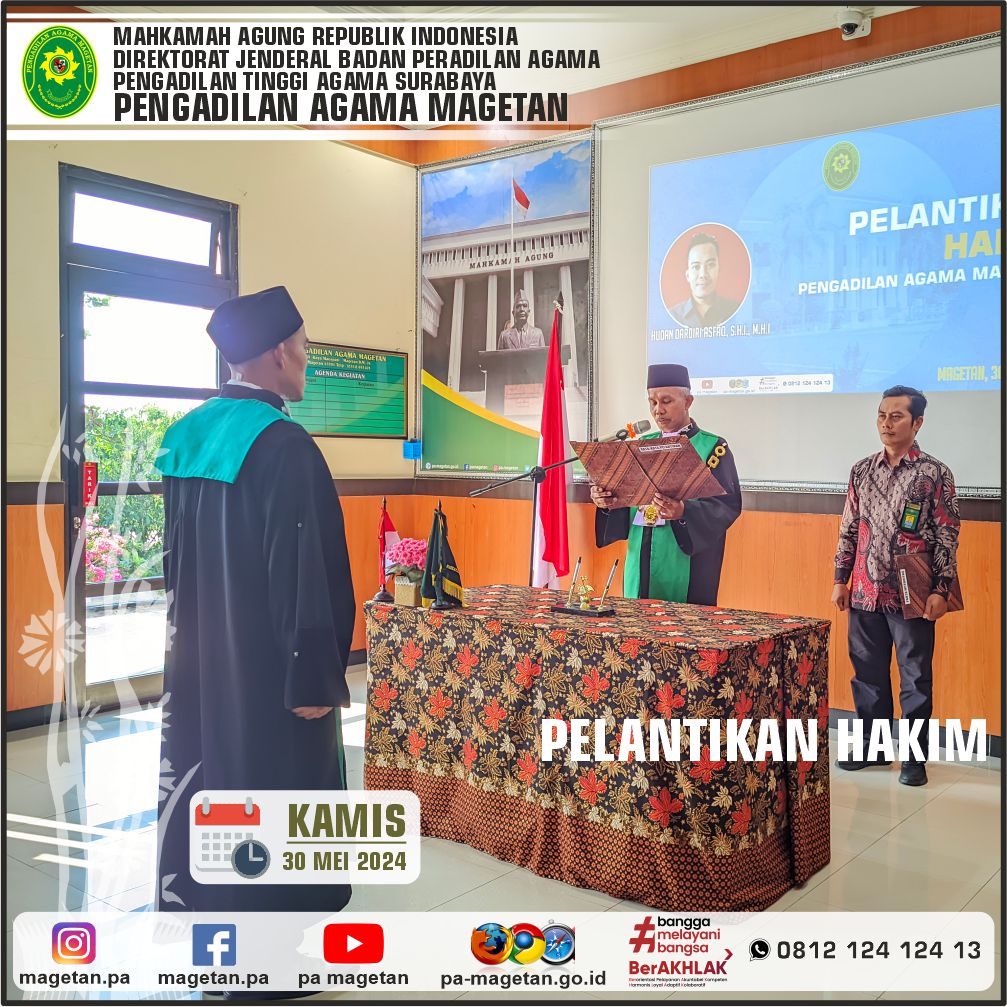 Magetan | pa-magetan.go.id | Ketua Pengadilan Agama Magetan melantik Hakim Pengadilan Agama Magetan (Hudan Dardiri Asfaq, S.H.I., M.H.I.). Pelantikan di didasarkan pada hasil rapat promosi dan mutasi Hakim Mahkamah Agung RI daam rapat tanggal 13 Mei 2024. Yang kemudian di sahkan melalui Petikan Keputusan Ketua Mahkamah Agung Republik Indonesia Nomor : 119/KMA/SK.KP4.1.3/V/2024 tentang Promosi dan Mutasi Hakim pada Lingkungan Peradilan Agama. Sebelumnya, Bapak Hudan Dardiri Asfaq, S.H.I., M.H.I. bertugas di Pengadilan Agama Soreang Kelas IB.