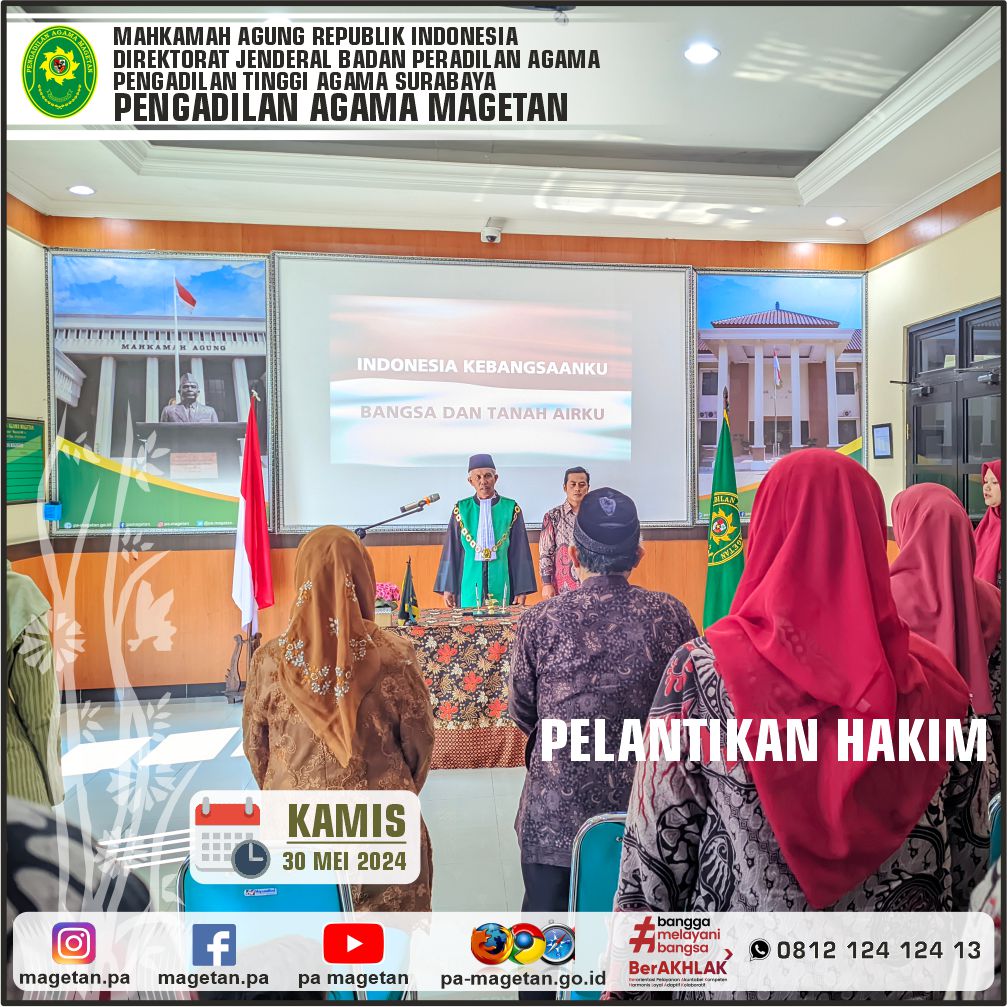 Kegiatan yang dilaksanakan di Media Center Pengadilan Agama Magetan berjalan dengan Khidmat dan Tertib yang diawali dengan menyanyikan lagu Indonesia Raya dan hymne Mahkamah Agung RI serta dilanjutkan dengan pembacaan Do’a yang di pandu oleh (Isa Ansori, SH) dilanjutkan dengan pembacaan surat keputusan dan pelantikan. Pelantikan ini di hadiri oleh seluruh keluarga besar Pengadilan Agama Magetan dan Keluarga hakim yang dilantik.