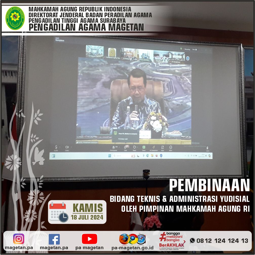Magetan | pa-magetan.go.id | Ketua Pengadilan Agama Magetan yang didampingi oleh Panitera, Sekretaris dan Para Hakim mengikuti Pembinaan Teknis dan Administrasi Yudisial Oleh Pimpinan Mahkamah Agung RI secara online dari Media Center Pengadilan Agama Magetan.