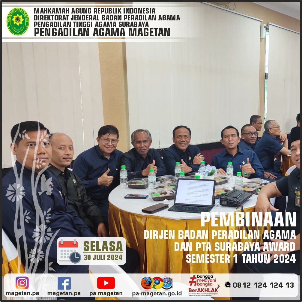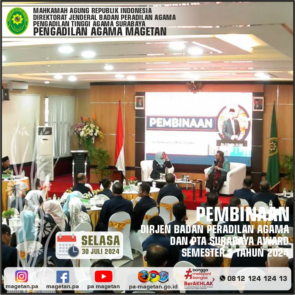 Kegiatan ini sebagai tindak lanjut Undangan PTA Surabaya nomor 3465/KPTA.W13-A/HM3.1.1/VII/2024 tanggal 29 Juli 2024. Pelaksanaan Pembinaan ini diikuti oleh seluruh Hakim Tinggi Pengadilan Tinggi Agama Surabaya, para Ketua, Panitera, dan Sekretaris Pengadilan Agama seWilayah PTA Surabaya, serta pejabat Struktural dan Fungsional PTA Surabaya. Pembinaan Direktur Jenderal Badan Peradilan Agama dan PTA Surabaya Award kali ini mengambil tema "Penguatan Kepemimpinan dalam rangka Peningkatan Kualitas Pelayanan Peradilan di Wilayah Pengadilan Tinggi Agama Surabaya".
