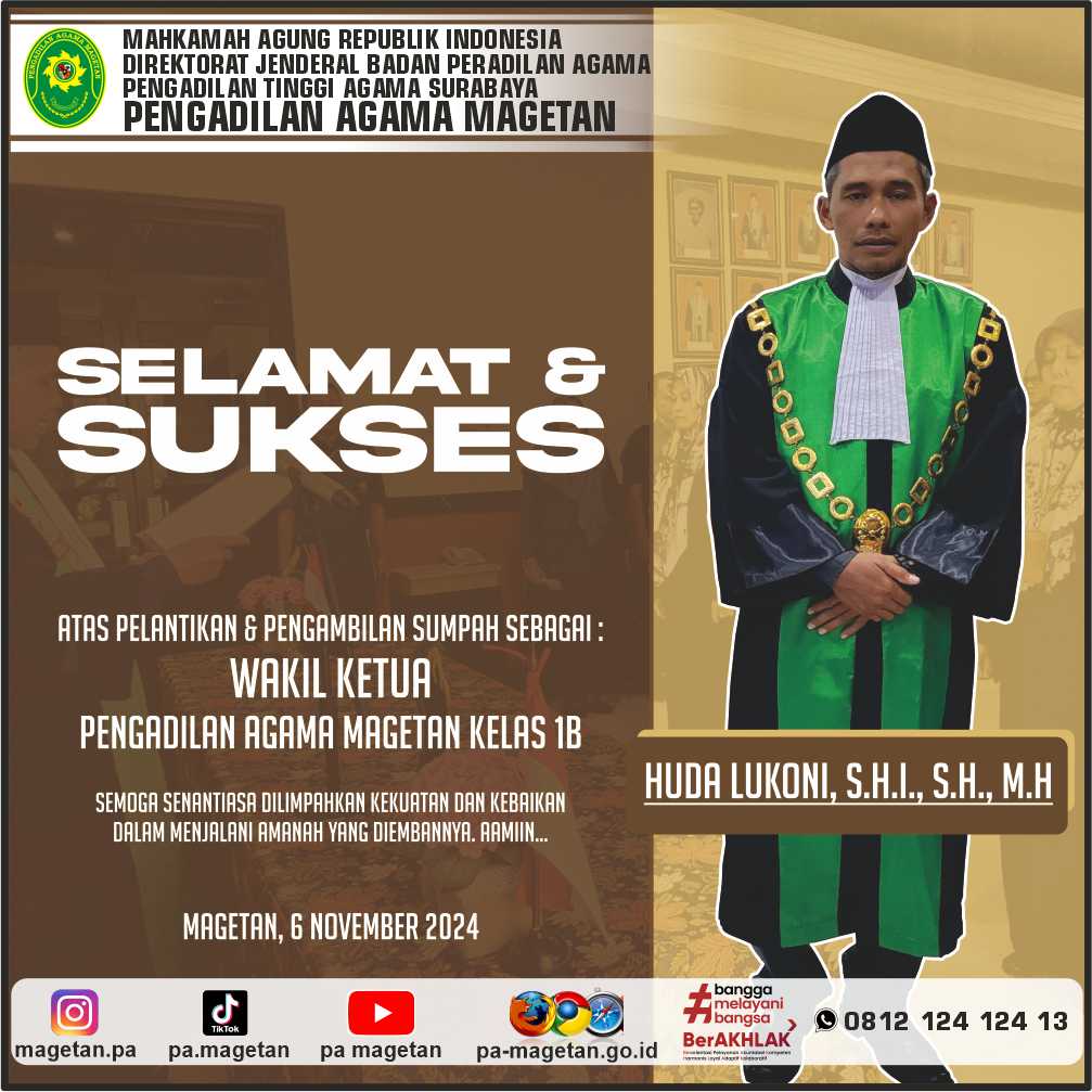Selamat & Sukses Atas Pengambilan Sumpah & Pelantikan Huda Lakoni, S.H.I, S.H, M.H Written by Admin on 06 November 2024. Written by Admin on 06 November 2024. Hits: 570