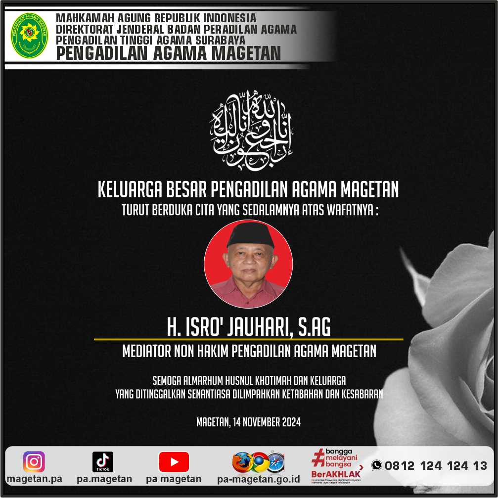 Turut Berduka Cita Yang Sedalamnya Atas Wafatnya : Bp. H. Isro' Jauhari, S.Ag Written by Admin on 14 November 2024. Written by Admin on 14 November 2024. Hits: 583