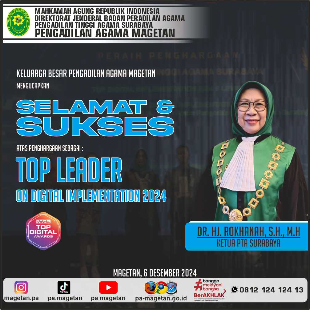 Selamat & Sukses Dr. Hj. Rokhanah, S.H., M.H Top Leader On Digital Implementation 2024 (It work Top Digital Awards) Written by Admin on 06 December 2024. Written by Admin on 06 December 2024. Hits: 590