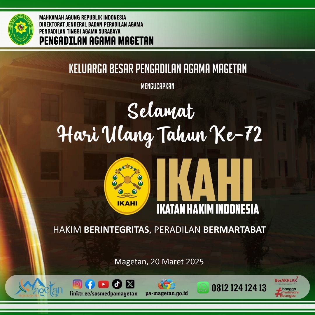 Selamat Hari Ulang Tahun Ikatan Hakim Indonesia (IKAHI) Ke-72 Written by Admin on 20 March 2025. Written by Admin on 20 March 2025. Hits: 828