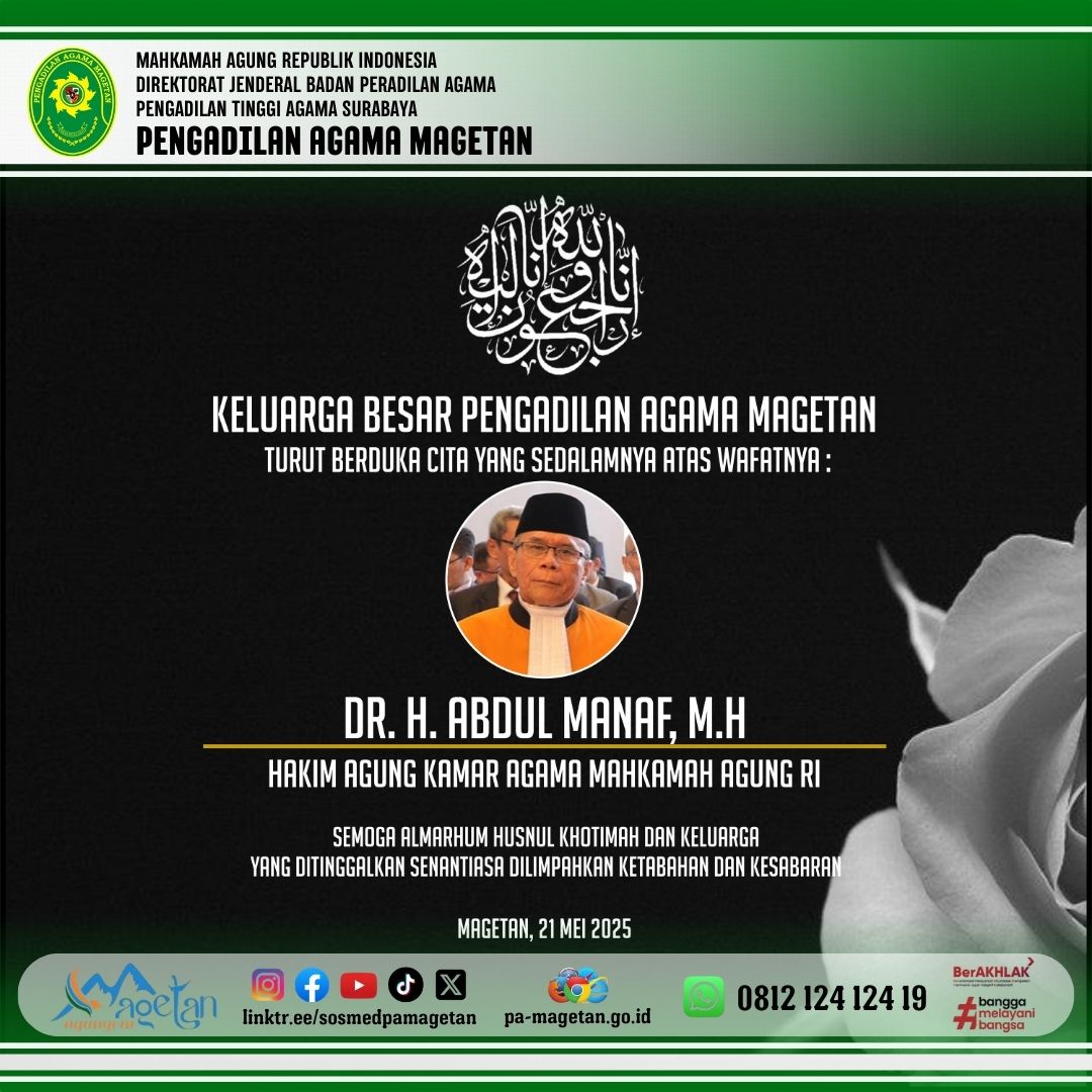 Turut Berduka Cita Yang Sedalamnya Atas Wafatnya : Bp. Dr. H. Abdul Manaf, M.H Written by Admin on 21 May 2025. Written by Admin on 21 May 2025. Hits: 407