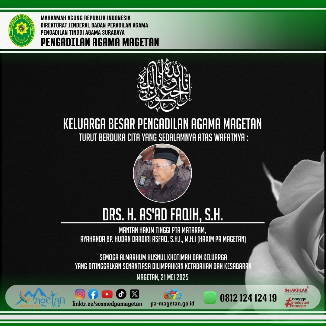 Turut Berduka Cita Yang Sedalamnya Atas Wafatnya : Bp. Drs. H. As'ad Faqih, S.H Written by Admin on 21 May 2025. Written by Admin on 21 May 2025. Hits: 450