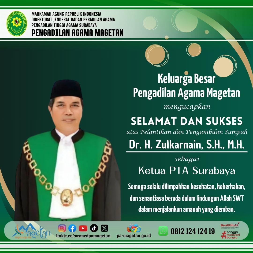 Selamat & Sukses Dr. H. Zulkarnain, S.H., M.H., Sebagai Ketua Pengadilan Tinggi Agama Surabaya Written by Admin on 11 June 2025. Written by Admin on 11 June 2025. Hits: 679