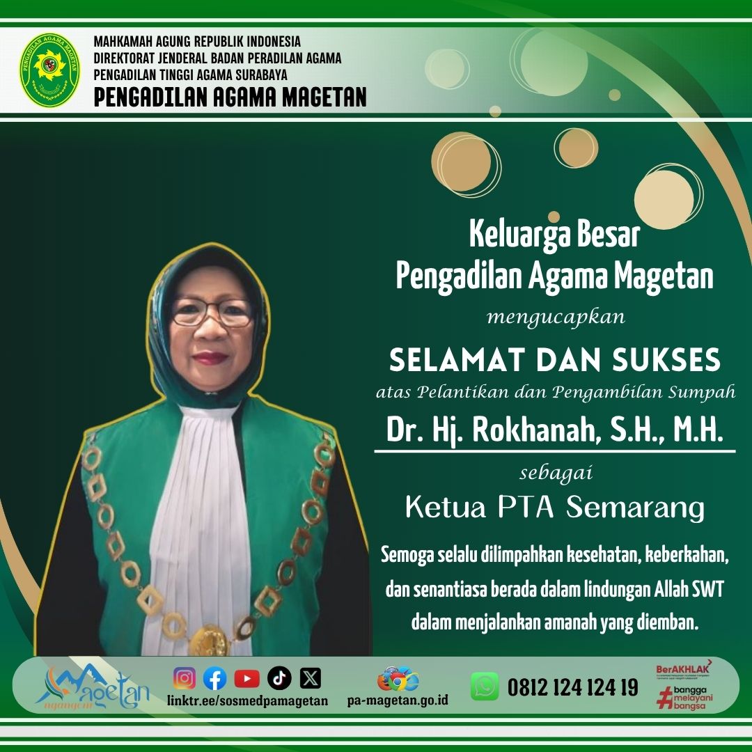 Selamat & Sukses Dr. Hj. Rokhanah, S.H., M.H., Sebagai Ketua Pengadilan Tinggi Agama Semarang Written by Admin on 11 June 2025. Written by Admin on 11 June 2025. Hits: 454
