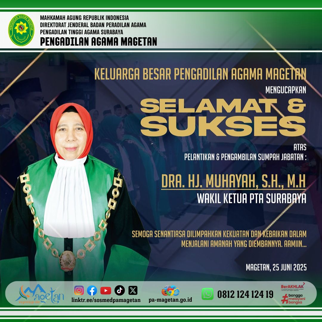 Selamat & Sukses Dra. Hj. Muhayah, S.H., M.H Written by Admin on 25 June 2025. Written by Admin on 25 June 2025. Hits: 337