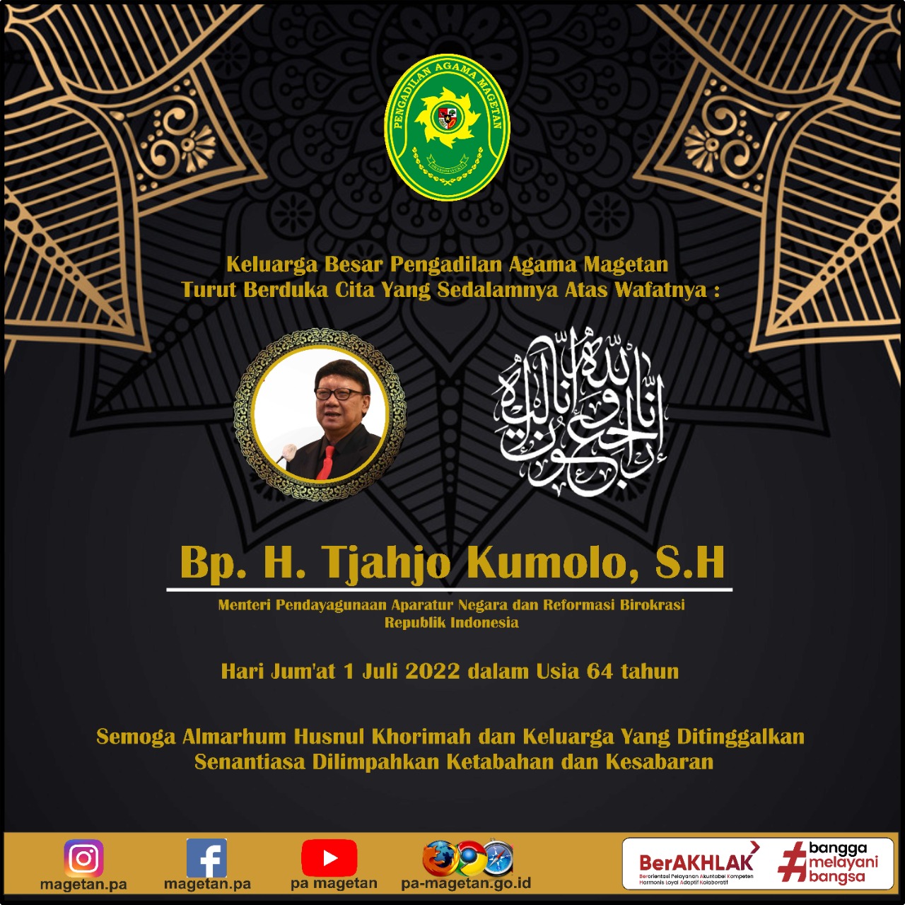 Turut Berduka Cita Yang Sedalamnya Atas Wafatnya Bp. H. Tjahjo Kumolo, S.H Written by Admin on 01 July 2022. Written by Admin on 01 July 2022. Hits: 994